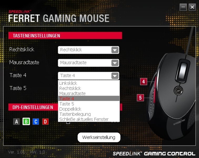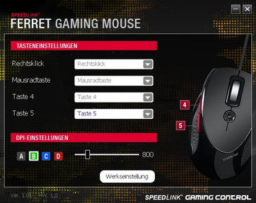 Bei den Features hält sich die Ferret etwas zurück. Neben den üblichen Mausfunktionen (drückbares Scrollrad, zwei zusätzliche Daumentasten), bietet die Gaming Mouse nur noch einen dedizierten DPI Umschalter. Die gewählte DPI Stufe ist mit der Beleuchtung des Mausrades gekoppelt. Somit kann man die eingestellte DPI Stufe einfach identifizieren. Die Zuordnung lässt sich im etwas schmucklosen Treiber in 400dpi Schritten ändern (maximal 3200 dpi).
