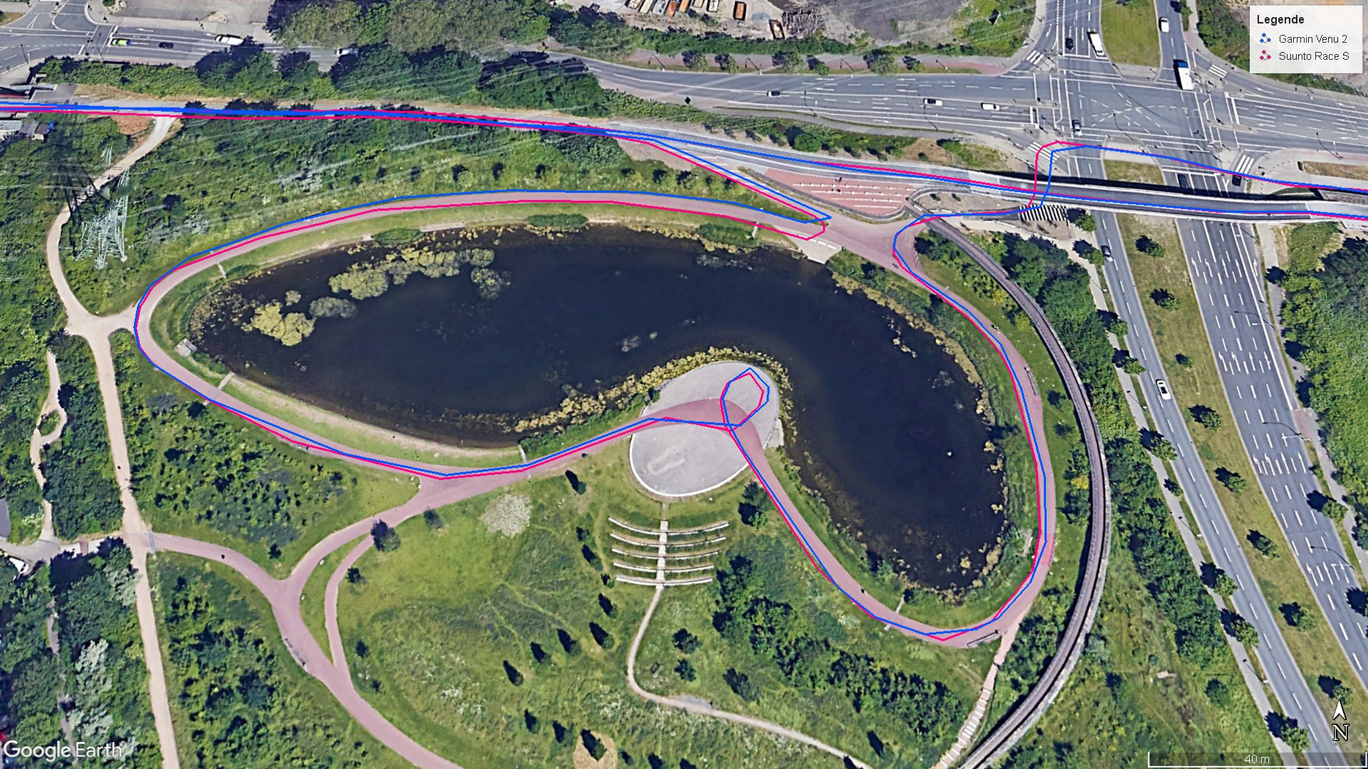 Die Suunto Race S unterstützt alle gängigen Satellitensysteme mit Dual-Band. Bei einer Radtour gemeinsam mit einer Garmin Venu 2 zeigt sie eine exakte Verortung, die absolvierte Strecke wird akkurat dargestellt.