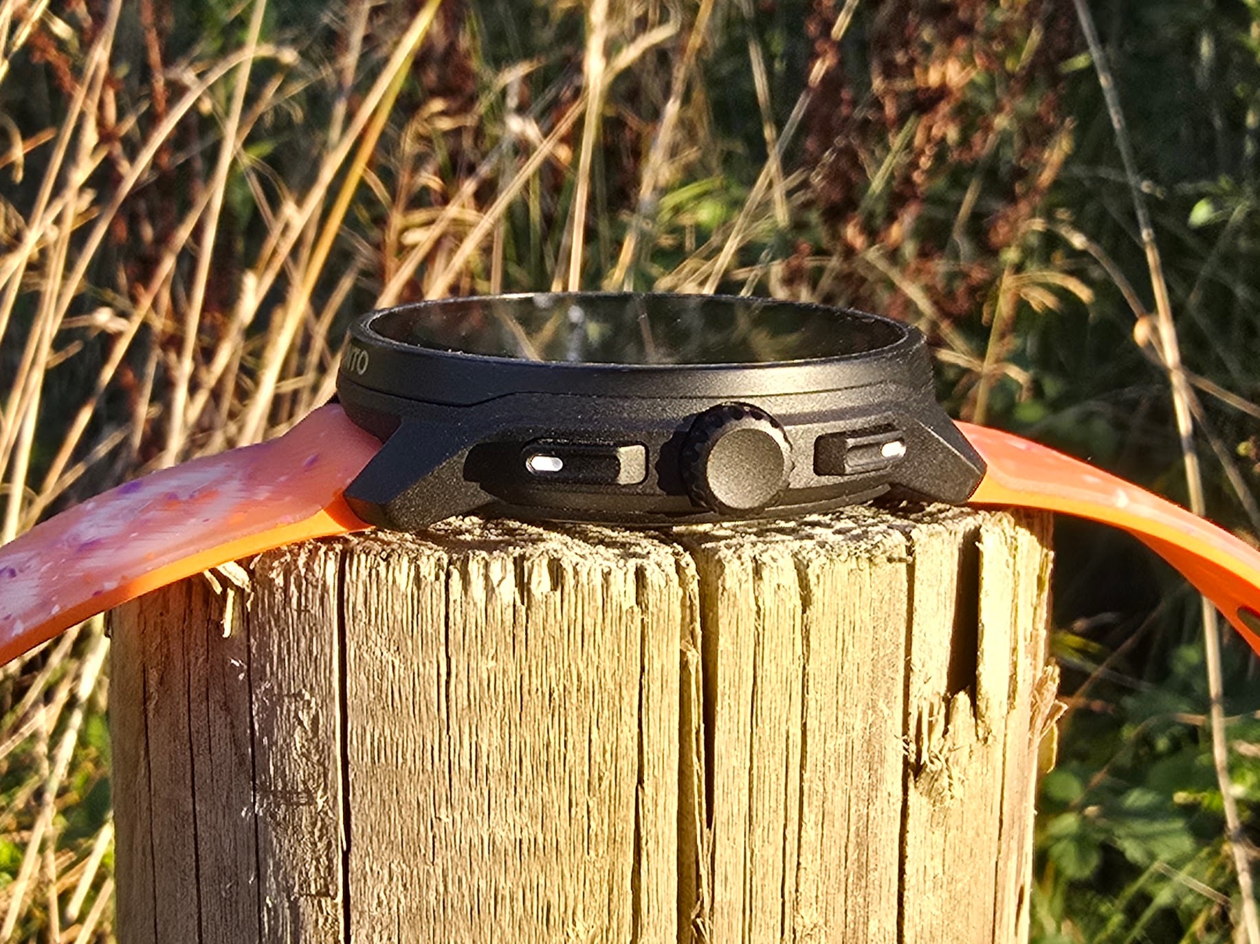 Die Tasten und Krone sitzen auf der rechten Seite des Gehäuses, eine Option zum Umkehren der Anzeige haben wir nicht gefunden. Auf der linken Seite gibt es mehrere Öffnungen für das Barometer und einen Lautsprecher.