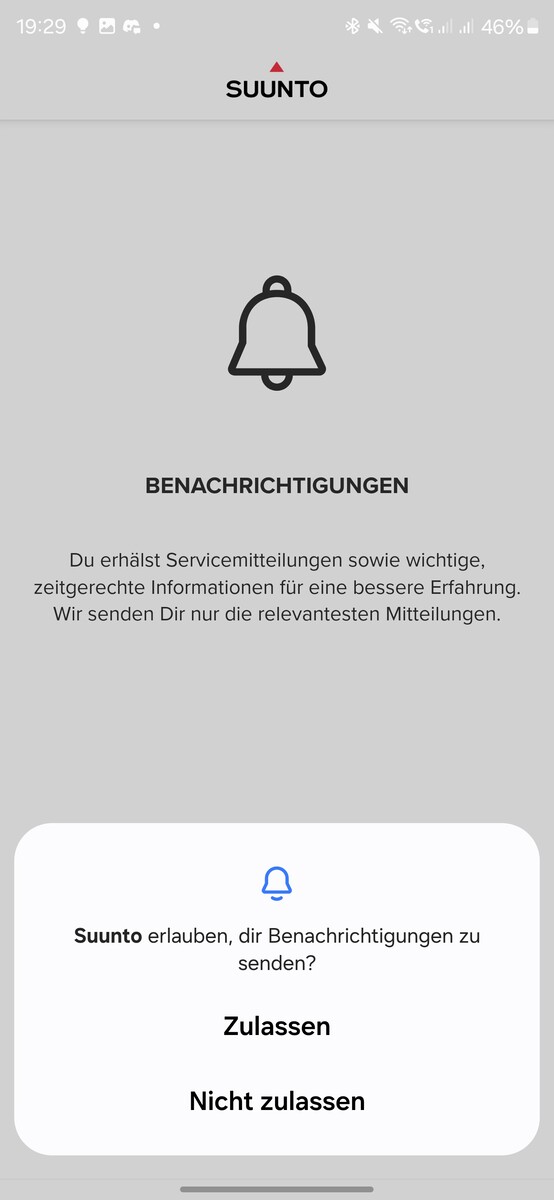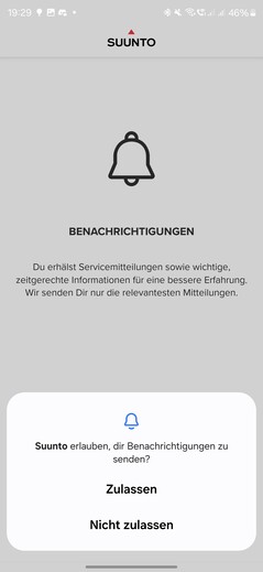 Die Suunto-App ist für iOS und Android verfügbar. Für die Nutzung muss ein Suunto-Konto erstellt werden. Noch bevor die Uhr verbunden werden kann, müssen der App einige Berechtigungen gegeben werden. Im Test wird die Smartwatch zügig gefunden - vorausgesetzt, dort wurden im Voraus alle Eingaben getätigt.