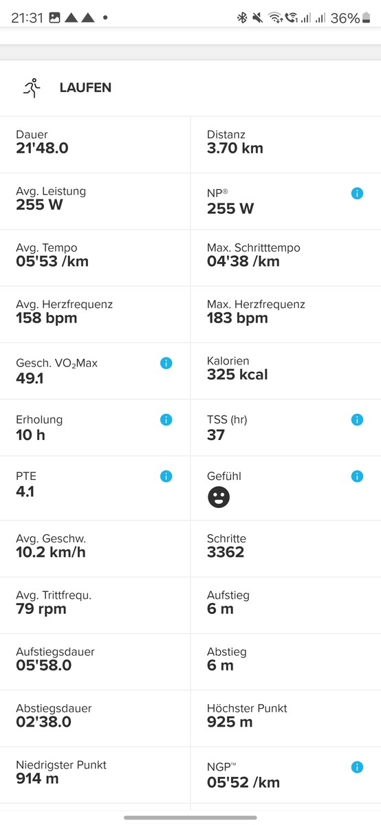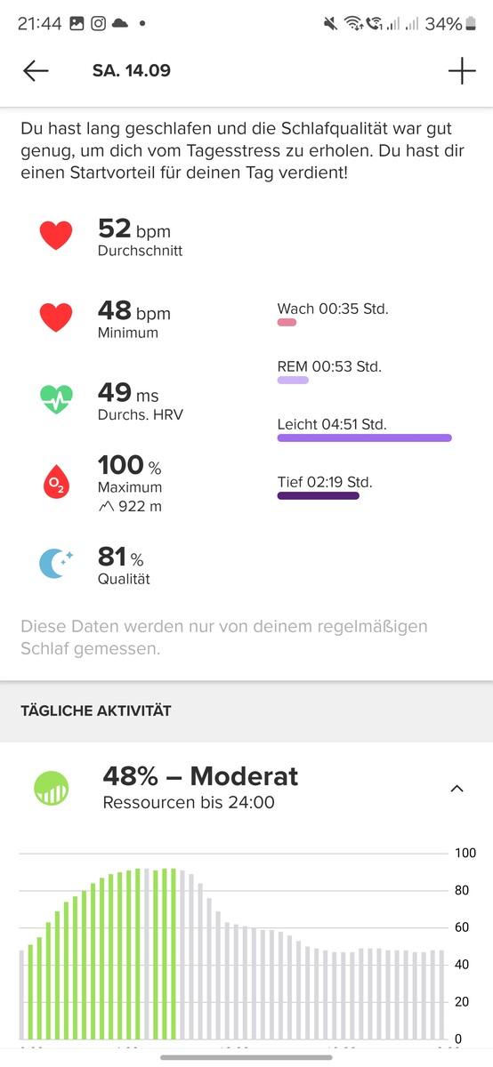 In der App werden außerdem Werte für die durchschnittliche Herzfrequenz, die minimale Herzfrequenz, die Herzfrequenzvariabilität und die Blutsauerstoffsättigung mit Angabe der Höhenmeter angegeben. Der Schlaf wird zudem mit einem Prozentwert bewertet.