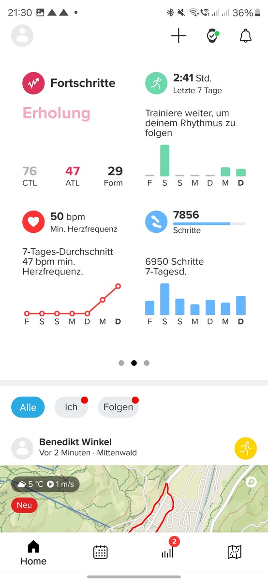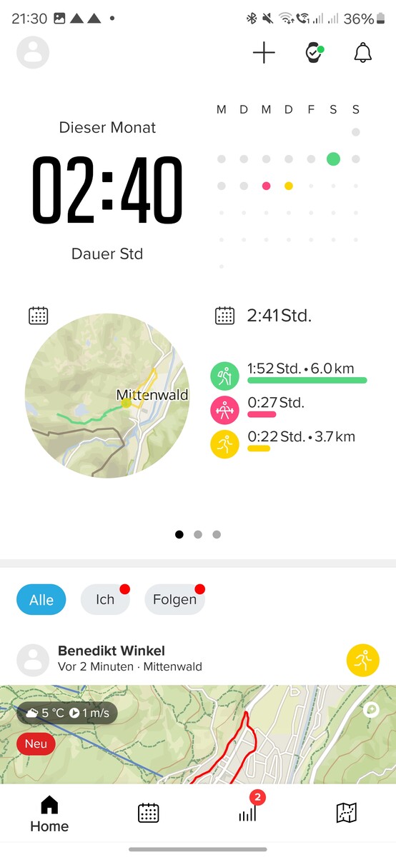 Bis die Satellitenverbindung aufgebaut ist, dauert es einige Sekunden, dafür haben wir im Test aber auch keine Abbrüche. Neue Tracks können über die Suunto App selbst erstellt werden. Auch der Import von GPX- und KML-Dateien ist möglich. Diese Routen können in verschiedenen Trainings absolviert werden.
