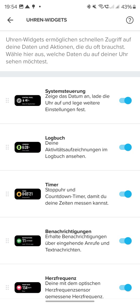 Lediglich die generelle Einstellung, ob Benachrichtigungen an die Smartwatch gesendet werden, das Herunterladen von Offline-Karten, Sport-Apps und Zifferblättern geschieht über die App. Außerdem können dort Sportmodi individualisiert und die Reihenfolge von Widgets angepasst werden.