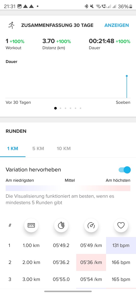 Wird das Always-on-Display genutzt, kommen wir bei mehreren kleinen Trainings auf eine Laufzeit von etwa fünf Tagen - das entspricht der Herstellerangabe. Wird das AoD deaktiviert, sind auch sieben bis acht Tage Nutzung ohne Nachladen möglich.