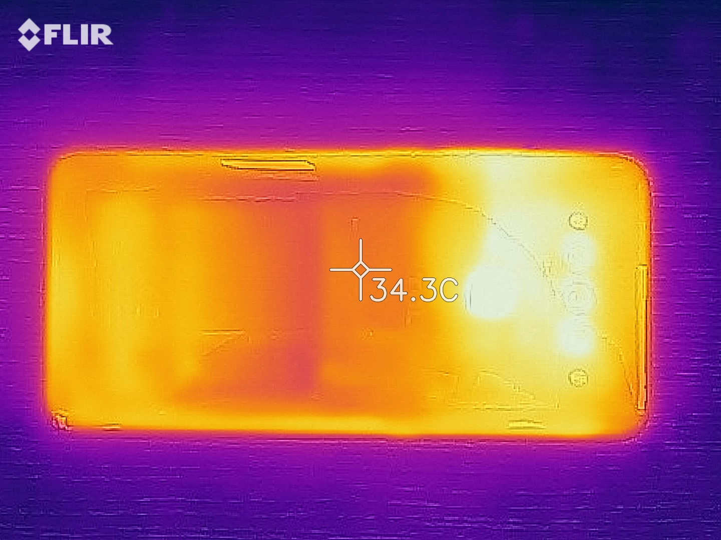 (+) Auf der Unterseite messen wir eine maximalen Wert von 39.5 °C (im Vergleich zum Durchschnitt von 34 °C).