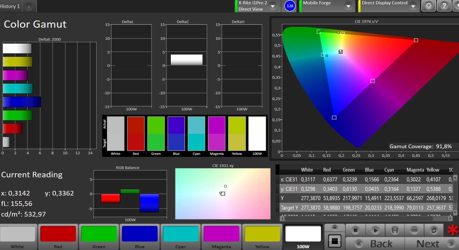 | Colorchecker dE 2000 max. * | 9.62 | 6.72 30% | 11.46 -19% | 18.4 -91% | 16.68 -73% |