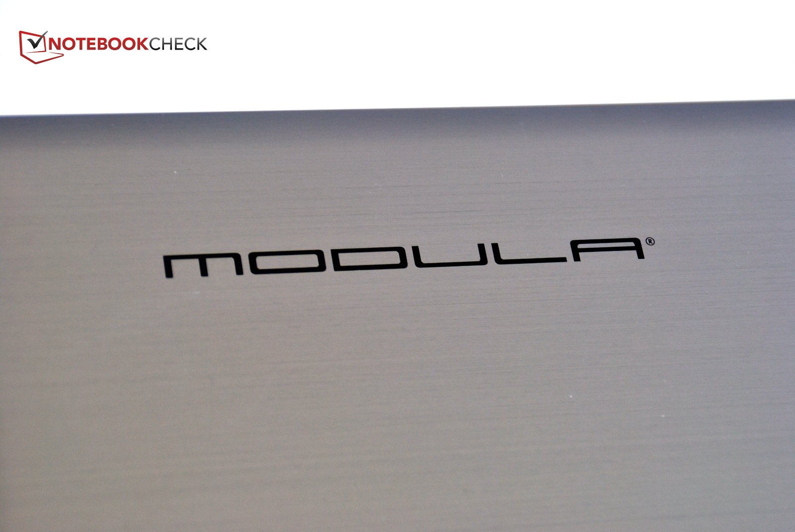 Zugeklappt macht das Modula Ultrabook einen sehr edlen Eindruck. Die graue, gebürstete Metalloberfläche des Displaydeckels zusammen mit dem stilvollen Schriftzug in Schwarz versprechen viel. Die Unterseite hält sich mit dem verwendeten grau lackierten Kunststoff dezent im Hintergrund.