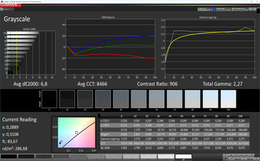Die Analyse mit unserem Fotospektrometer und der CalMAN Software zeigt für die Preisklasse durchschnittliche Abweichungen in der Farb- (6,7) und Graustufendarstellung (6,8). Die gemessene Farbtemperatur liegt mit 8.644 Kelvin weit über dem Idealwert von 6.500 Kelvin, sodass ein deutlicher Blaustich in den Graustufen erkennbar ist.