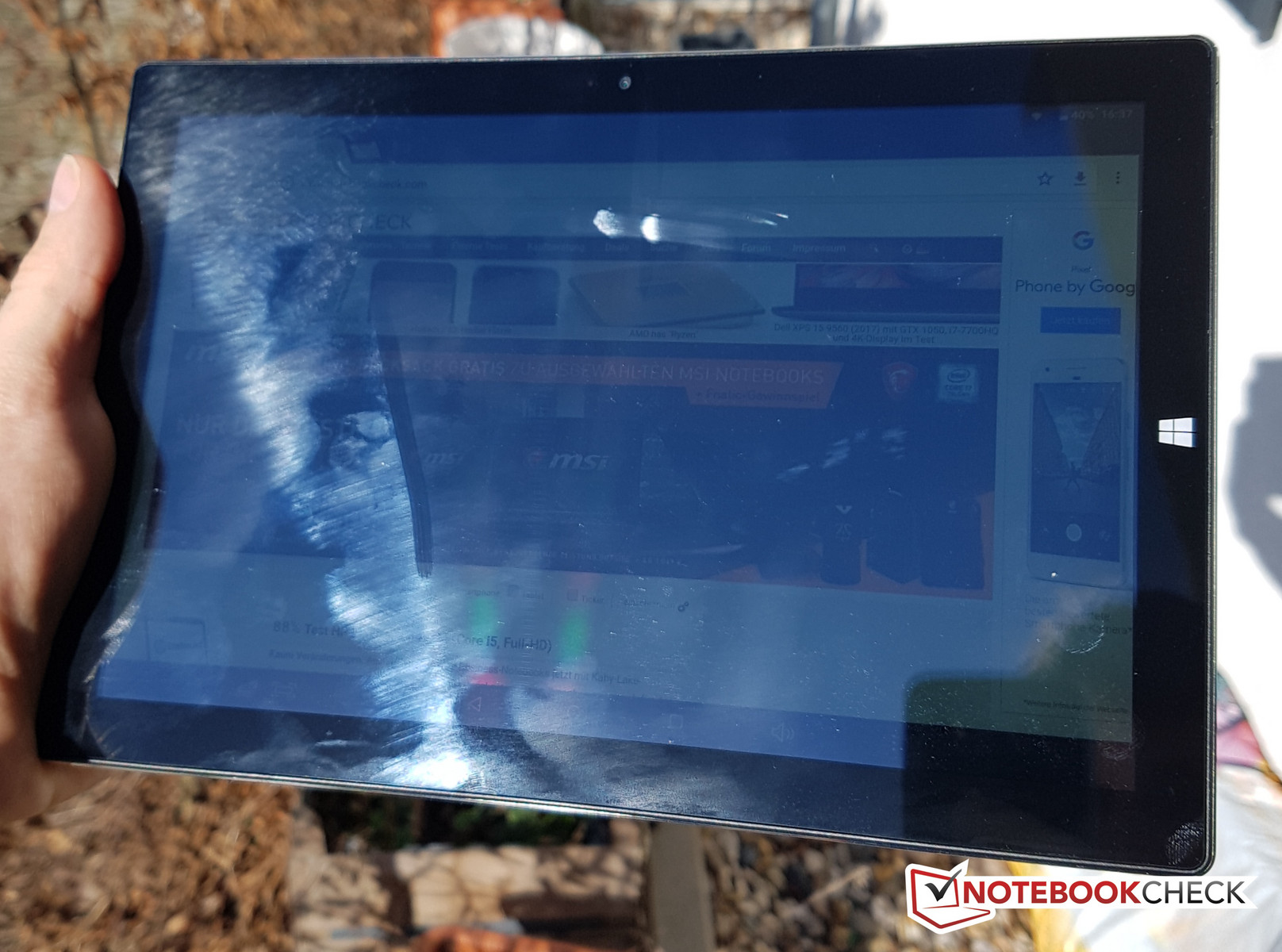 Aufgrund der vergleichsweise geringen Helligkeit erreicht das Tbook 10s im Freien eine nur begrenzte Lesbarkeit. Direktes Sonnenlicht verursacht jedoch gemeinsam mit dem glänzenden Bildschirm und vorhandenen Fingerabdrücken Probleme beim Ablesen des Displays. Die Blickwinkelstabilität ist IPS-typisch sehr gut.