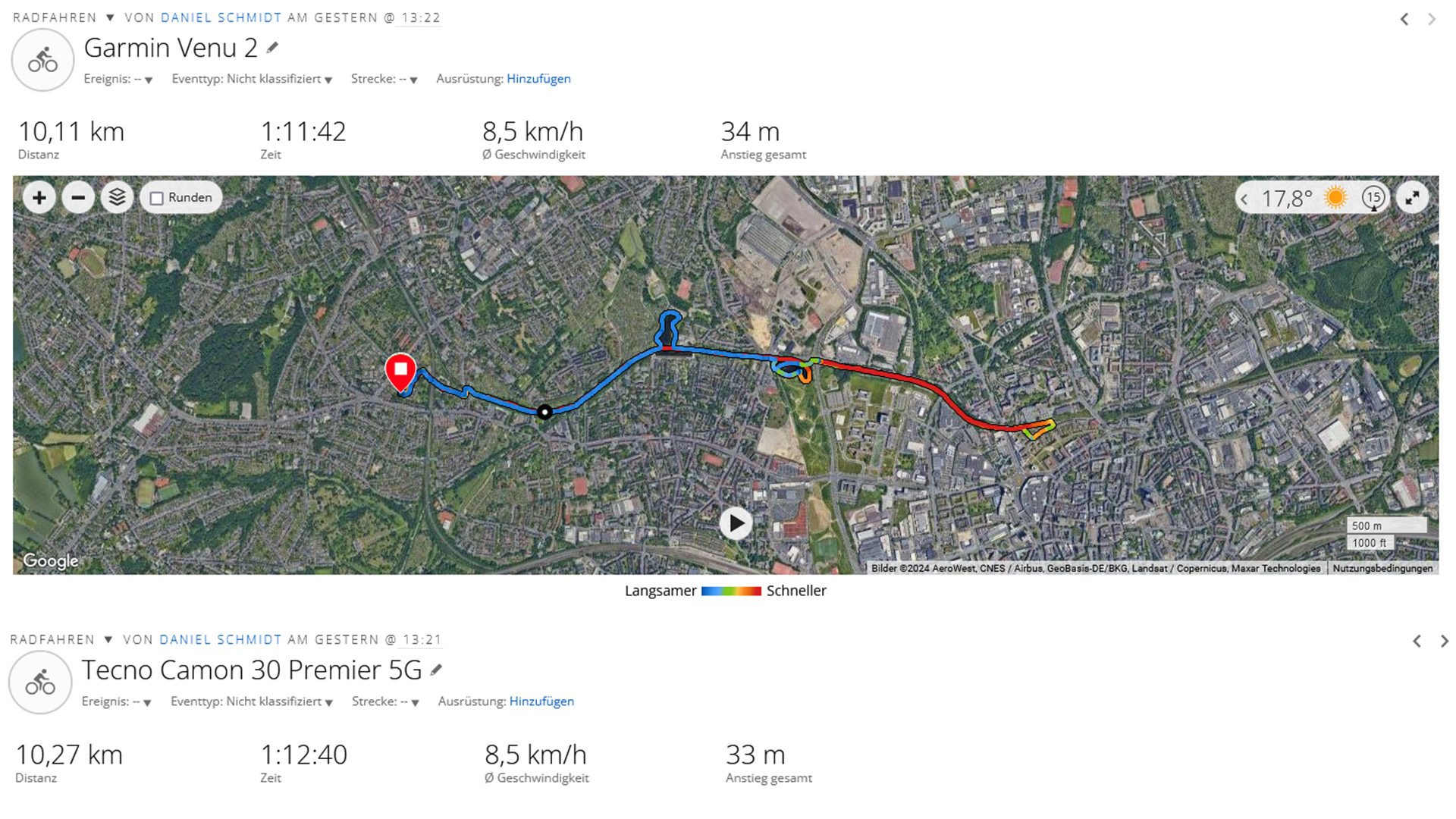 Wir haben das Camon 30 Premier 5G mit auf eine Radtour genommen. Dabei überzeugt das Gerät insgesamt mit exaktem Tracking, von einer Abweichung abgesehen.