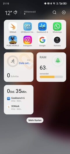 Anders als viele andere Hersteller bietet Tecno bei einem Wisch von links nach rechts - vom Homescreen aus - keine Google-Karten, sondern verschiedene Sammlungen und Übersichten. Ab Werk werden die RAM-Nutzung, Fitnesswerte und häufig verwendete Apps gezeigt.
