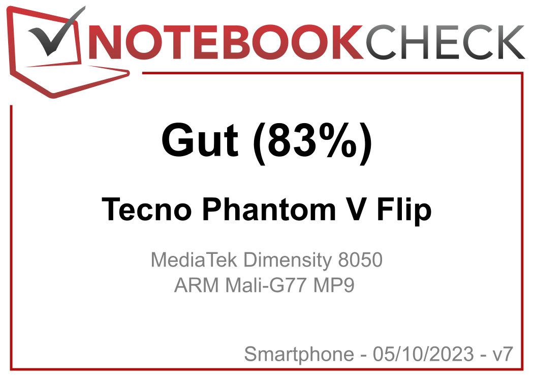 | 83.3 % v7 (old) | 10 / 2023 | Tecno Phantom V Flip Dimensity 8050, Mali-G77 MP9 | 194 g | 256 GB UFS 3.1 Flash | 6.90" | 2640x1080 | |