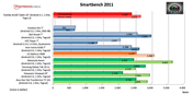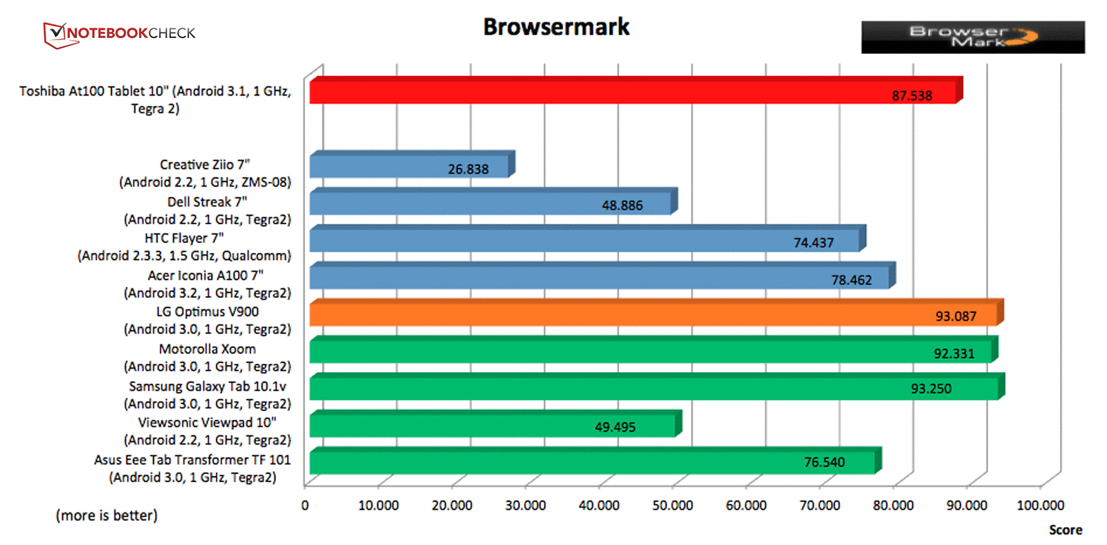 Im ersten Benchmark, dem Browsermark, erreicht das Toshiba AT100 zwar keine Top-Platzierung, rutscht aber auch nur ganz knapp am dritten Platz vorbei. Die erzielten 87.538 Punkte reichten dann doch nicht aus, um das Motorola Xoom (Android 3.0, Tegra 250) zu schlagen. Trotzdem muss sich das Toshiba Tablet sicherlich nicht verstecken.