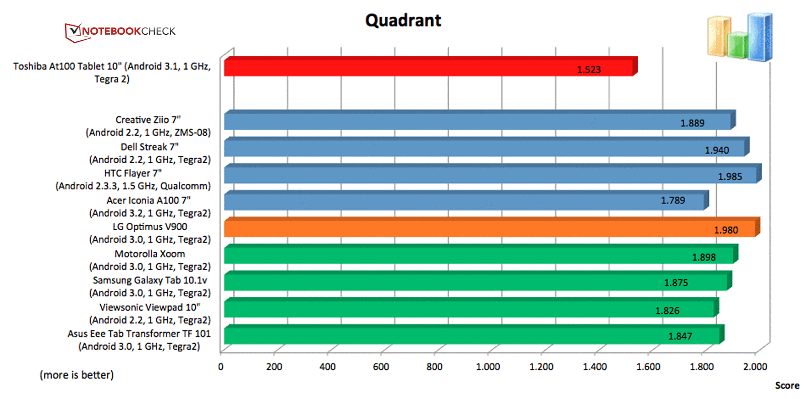 Beim Quadrant Benchmark beginnt das Toshiba AT100 zu schwächeln und fällt mit 1.523 auf den letzten Platz ab. Trotz mehrerer Durchläufe änderte sich das Ergebnis kaum.