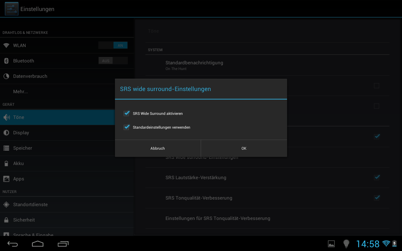 Ein erster Pluspunkt bekommt das AT300SE, da sich die Lautsprecher nicht auf der Geräterückseite befinden und man keine Abwertung im Klang feststellen kann, sobald man es auf einen glatten Untergrund legt. In den Einstellungen findet man die Möglichkeit diverse „Audio-Verbesserungs“-Optionen auszuwählen. Schaltet man während der Musikwiedergabe die einzelnen Modi an und ab, bemerkt man durchaus Klangunterschiede. Die „SRS Lautstärke-Verstärkung“ kann getrost deaktiviert bleiben, denn dies kommt dem Klang zugute. Dank der SRS-Technologie hinterlässt der Klang der Stereo-Lautsprecher einen positiven Eindruck, wenn auch die Höhen etwas stark betont werden. Ist die Lautstärke-Verstärkung deaktiviert, ist auch der maximale Pegel noch mehr oder weniger angenehm zu ertragen und der Klang ist weitestgehend klar. Um auf den vollen Musikgenuss zu kommen, sollte man jedoch Gebrauch von der 3,5-mm-Buchse machen oder die Musik per Funk auf ein Abspielgerät streamen. Bezüglich der Basswiedergabe hat sich beim AT300SE, genau wie bei anderen Modellen, wenig verändert. Wer auf gewissen Tiefgang sein Hauptaugenmerk legt, wird mit der integrierten Lautsprecherlösung sicherlich nicht glücklich.
