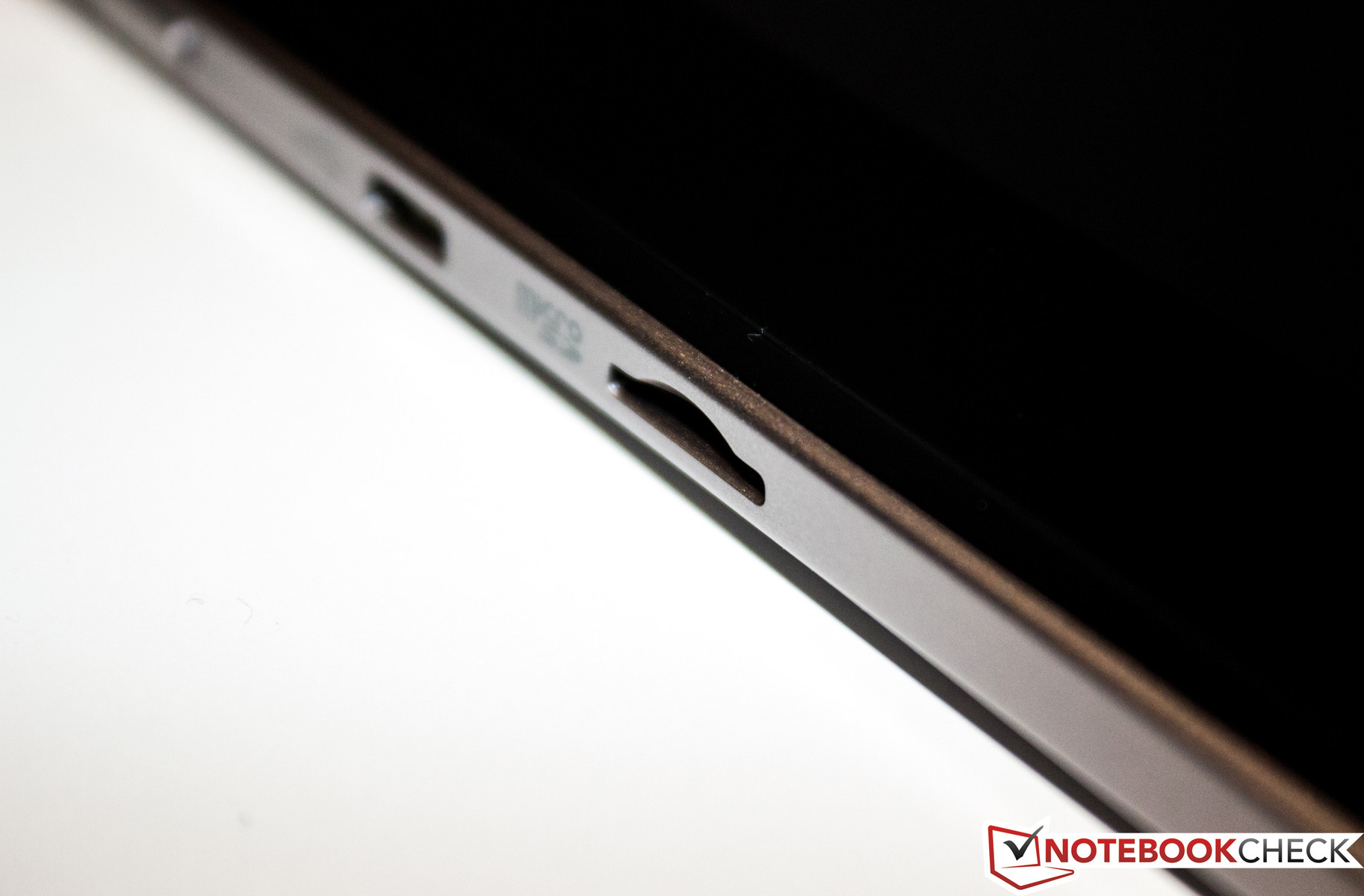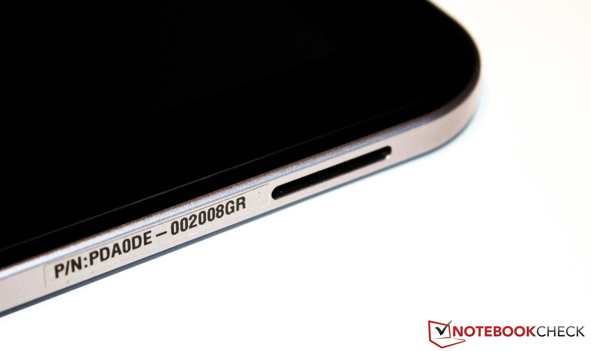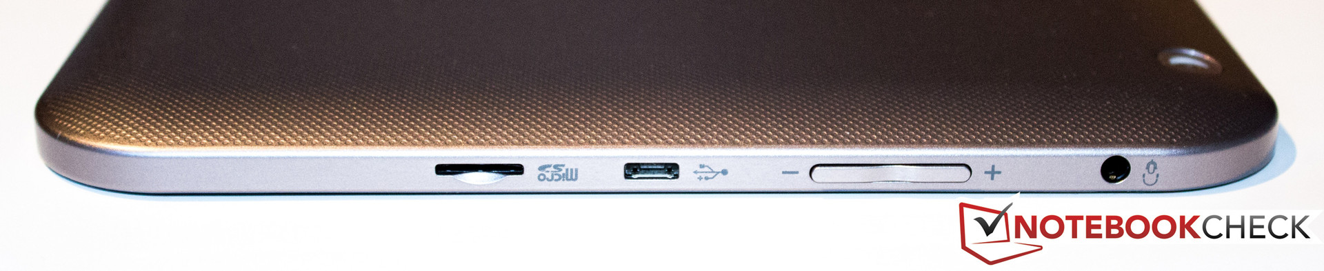 Bei der Ausstattung hat sich im Laufe der Zeit ein gewisser Standard eingeschlichen. Ab und an verbaut ein Hersteller keinen Micro-SD-Slot, weil der interne Speicher ausreichend bemessen ist oder es kommt ein selten gesehenes Feature, wie beispielsweise ein Dockinganschluss, hinzu. Das AT300SE tendiert hierbei weder in die eine, noch in die andere Richtung. Alle Anschlussmöglichkeiten befinden sich an der linken Geräteseite. Von oben nach unten sehen wir einen 3,5-mm-Klinkenanschluss (Headset kompatibel), einen Micro-USB-Slot und den Micro-SD-Einschub. Positiv an dem USB-Anschluss fällt auf, dass dieser zugleich als Schnittstelle zu einem PC (Datenübertragung), sowohl zum Aufladen des AT300SE genutzt werden kann. Leider werden derzeit, am häufigsten bei Tablets vorzufinden, proprietäre Netzteilanschlüsse verwendet. Ist die Kabelverbindung zu einem Computer hergestellt, wird das Tablet umgehend als Wechseldatenträger eingebunden und kann bequem mit Dateien bespielt werden. Umgekehrt, als Host (mit entsprechendem USB-OTG-Kabel), lassen sich Probleme erkennen. Eine Verbindung mit einer Maus (Hersteller Logitech) oder einer externen Festplatte konnten wir auf Anhieb nicht herstellen.