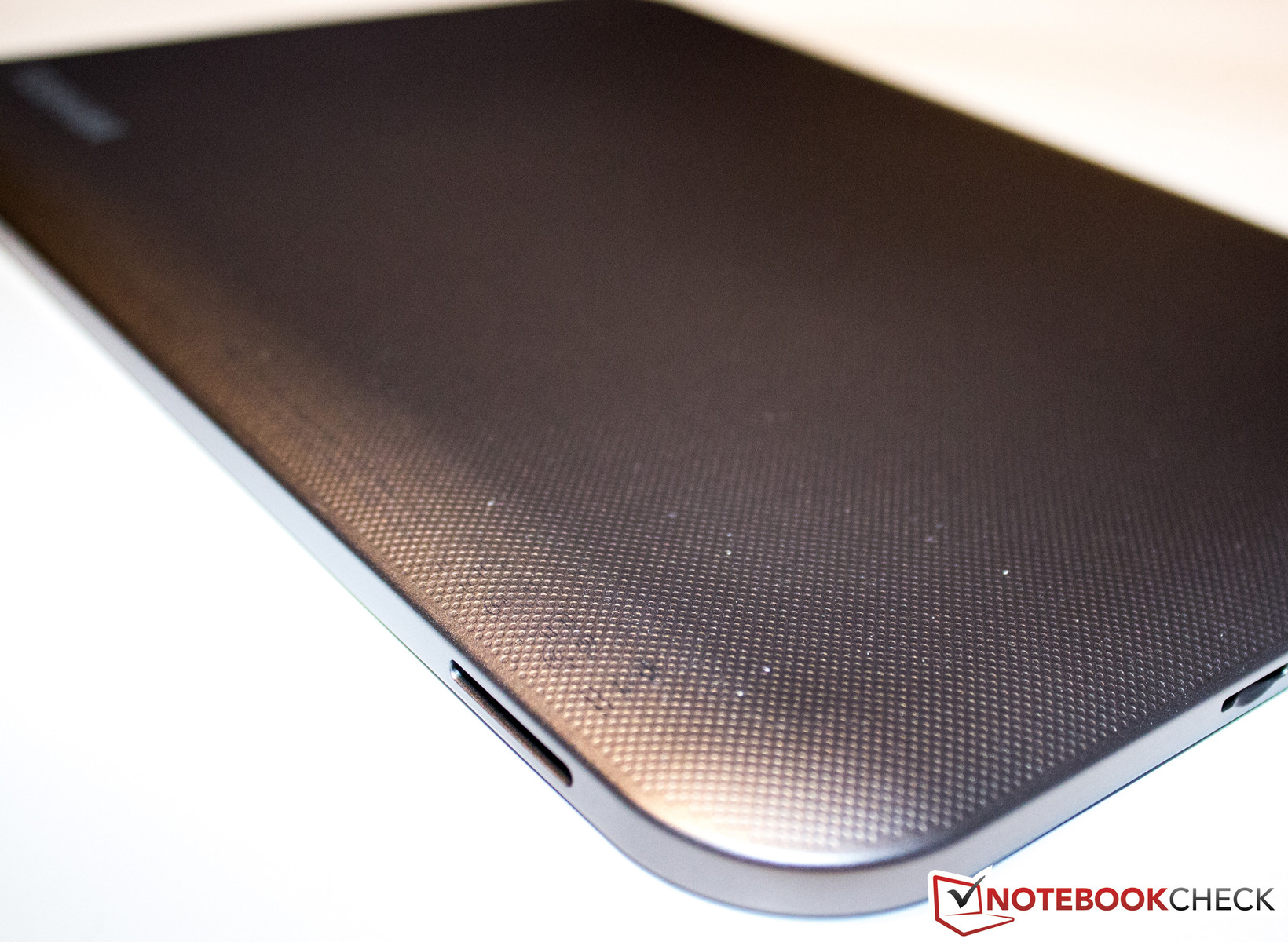Trotz des Gesamtgewichts von 625 Gramm ist die Materialwahl eher schlicht. Beim ersten Blick auf die Geräterückseite könnte man denken, es handele sich um Aluminium. Dieser Gedanke verflüchtigt sich beim ersten Kontakt ziemlich schnell, denn es handelt sich um strukturiertes Polycarbonat. Gerade weil es sich bei dem Basecover um Kunststoff handelt, vermittelt das AT300SE den Eindruck, es stecke einen härteren Umgang locker weg. Dieser erste Eindruck verfestigt sich zunehmend über die Testdauer, denn wir haben die Gehäuserückseite nicht mit Samthandschuhen behandelt und finden trotzdem keinen einzigen Kratzer. Ein Nachteil des Polycarbonats ist die Drucksensitivität. Je näher man sich der Tablet-Mitte nähert, desto weiter lässt sich der Kunststoff eindrücken. Gleiches beobachten wir auch, sobald wir das Gerät verwinden. Anlass zur Kritik bietet das Gehäusedesign an der Displayseite. Die Umrandung schließt bündig mit dem Display ab – weniger Schutz für das Panel gegen kleine Kratzer.