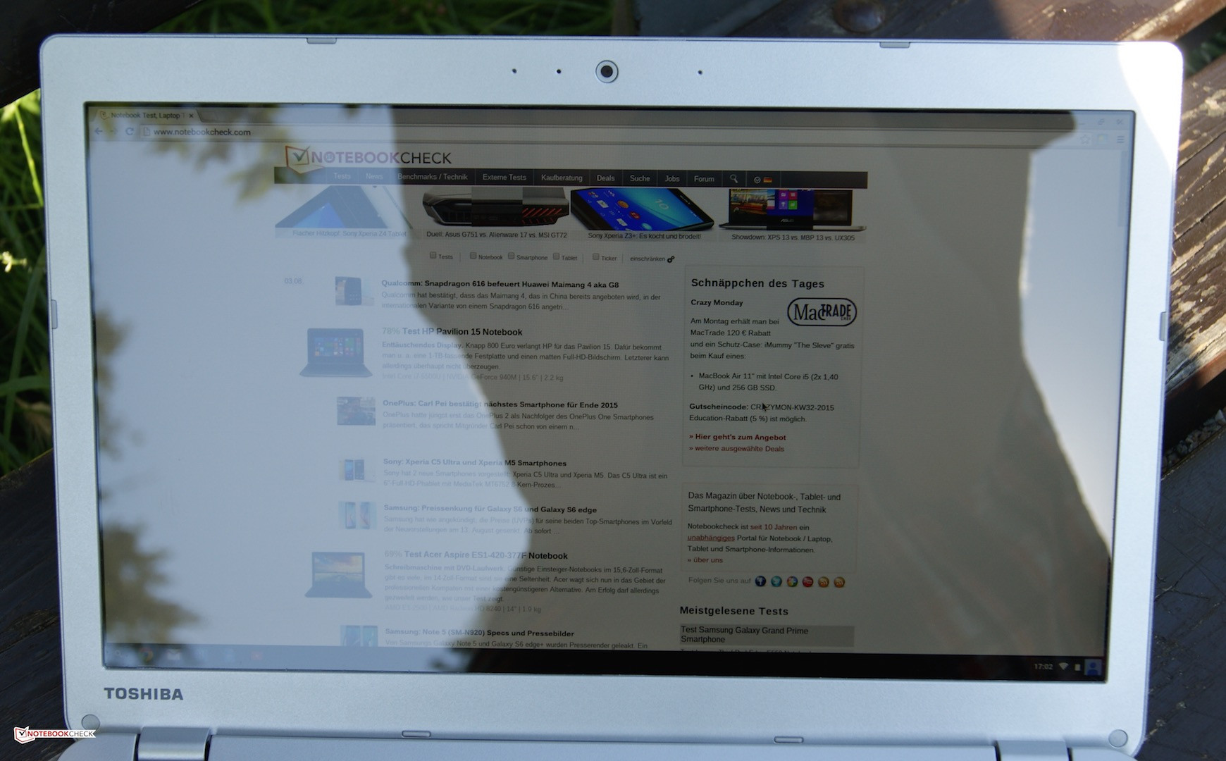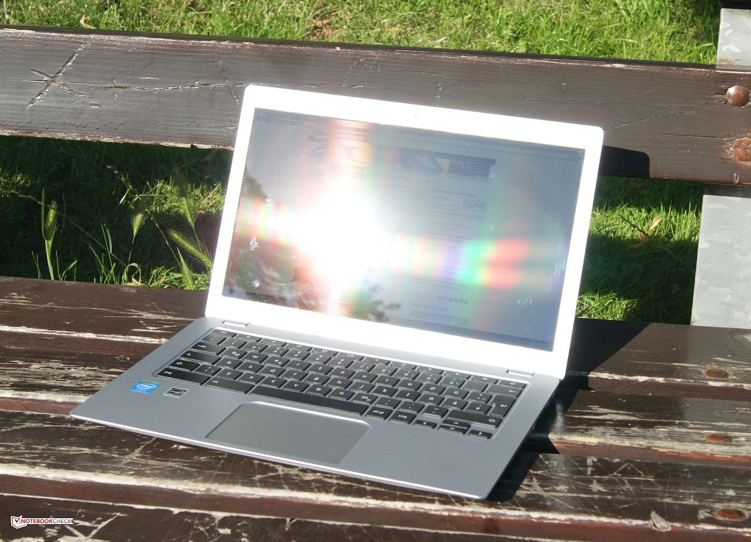 Das leichte Chromebook ist für den mobilen Einsatz prädestiniert. Obwohl die Helligkeit in Räumlichkeiten fast immer ausreicht, stößt es im Freien allerdings an seine Grenzen. Das spiegelnde Display kann eintreffende Sonneneinstrahlung mit seiner Helligkeit nicht ausgleichen. Bei bewölkter Umgebung oder an schattigen Orten gelingt der Einsatz dennoch.