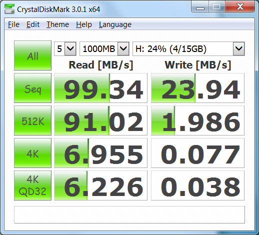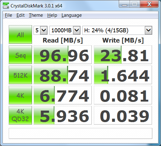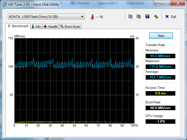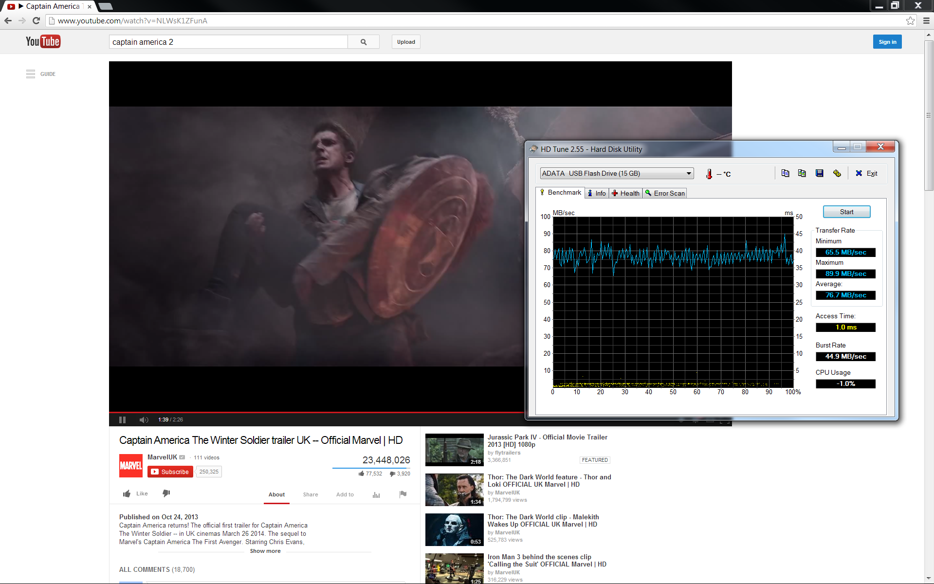 Mit der gleichzeitigen Verwendung von HD Tune und der Wiedergabe eines 1080p-YouTube-Videos sinkt die Leistung am USB-3.0-Anschluss von ~100 MB/s auf ~75 MB/s. Bei einem zweiten Test haben wir HD Tune ohne ein Video im Hintergrund ausgeführt, aber auch hier erreichten wir nur 75 MB/s. In diesem Fall scheint die Bandbreite von USB 3.0 der begrenzende Faktor bei gleichzeitiger Verwendung des Videoausgangs und der USB-Anschlüsse zu sein. Für die volle Leistung der USB-3.0-Anschlüsse sollte also kein externer Monitor angeschlossen sein.