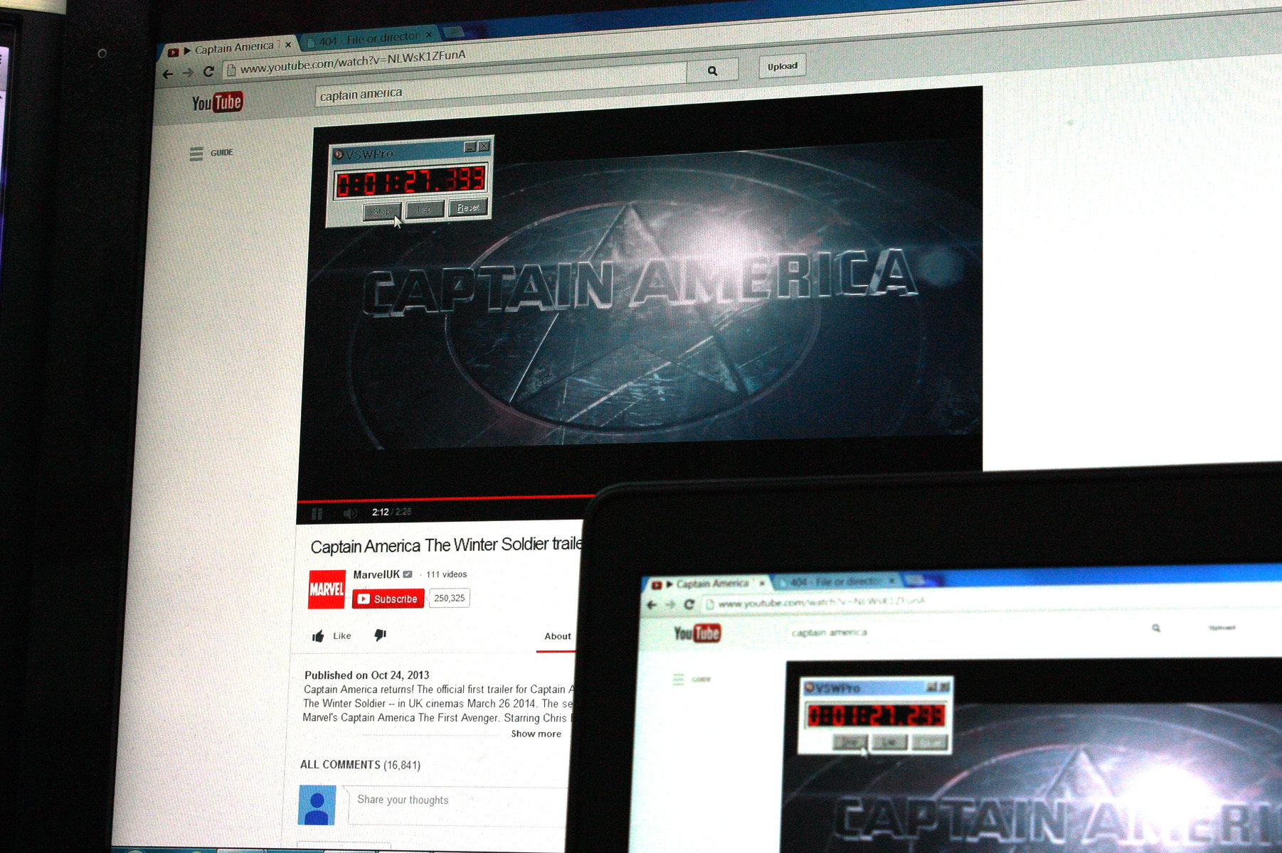 Wir haben den Test ein zweites Mal durchgeführt, dieses Mal aber mit einem 1080p-YouTube-Video im Hintergrund. Unser Timer zeigt dabei eine deutliche Diskrepanz von bis zu 100 ms an. Dies hat auch mit dem bereits erwähnten Ruckeln bei einem volleren Bildschirm zu tun (mehr aktive Fenster oder Bilder). Bei der Rückkehr auf den Windows Desktop normalisiert sich die Verzögerung wieder.