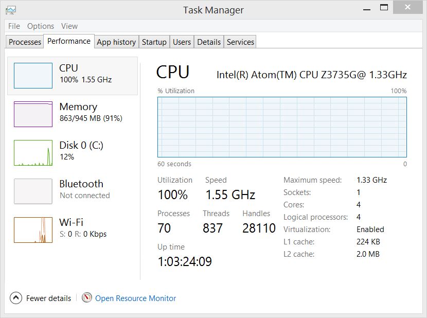 Auch wenn die Benchmarks Informationen über die Leistung der einzelnen Komponenten liefern, gibt es eine Frage, die durch diese Ergebnisse nicht beantwortet werden kann. Für ein modernes Gerät mit Windows ist 1 GB Arbeitsspeicher ziemlich wenig, und wir können Leistungseinbußen beim Encore 2 WT8 bestätigen. Sowohl die Speicherauslastung als auch die Auslagerungsdatei zeigen, dass die Leistung bei der gleichzeitigen Verwendung von Anwendungen fällt. Beim Multitasking lag der zugesicherte Speicher (Speicher in Verwendung, sowohl physikalischer als auch virtueller Speicher) bei fast 3 GB. Während dieser Zeit war die Auslagerungsdatei kontinuierlich im Einsatz, weshalb auch die Festplatte öfter aktiv war. Der Wechsel zwischen Anwendungen wird langsam, Webseiten können sich aufhängen, und die Leistung fällt auf inakzeptable Level. Wir haben die beiden Hintergrunddienste Google Chrome (der anscheinend sehr viel Speicher braucht) und Toshibas Service Station deaktiviert, aber selbst nach einem Neustart betrug die Größe des zugesicherten Speichers beinahe 1 GB, wobei ein Teil auf der Festplatte ausgelagert war.