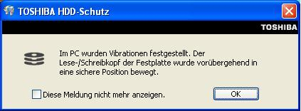 Als Massenspeichermedium kommt eine hauseigene Festplatte mit der Kennung MK1255GSX mit einer Arbeitsgeschwindigkeit von 5400 Umdrehungen pro Minute und einer Bruttoapazität von 120 GB zum Einsatz. Zum Schutz der Dateien die auf der Festplatte gespeichert sind, besitzt diese einen 3D Fallsensor, die bei ruckartigen Bewegungen den Plattenkopf blitzschnell und sicher parkt. Der Sensor ist unserer Meinung nach aber etwas zu sensibel geeicht, da man selbst beim behutsamen verschieben des Netbooks schon die Meldung bekommt, dass Vibrationen festgestellt wurden und somit der Lese-/Schreibkopf in eine sichere Position bewegt wird. Hier hat es Toshiba fast etwas zu gut gemeint, aber wie schon das Sprichwort sagt: „Besser Vorsicht als Nachsicht."