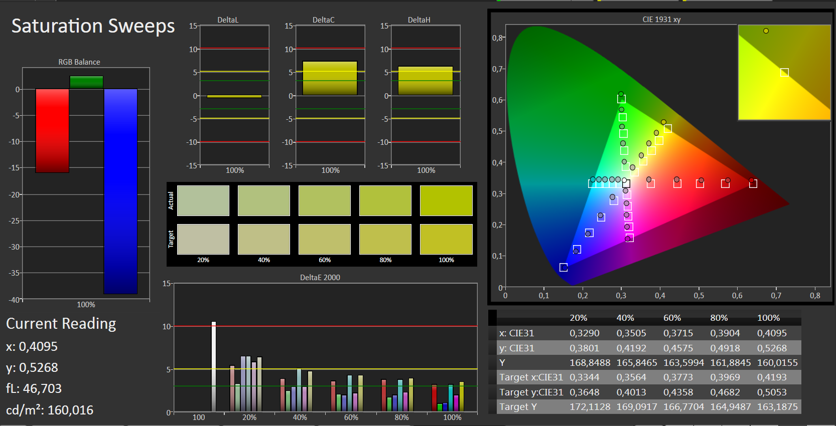 Entsprechend gut, aber nicht sehr gut fallen die DeltaE-Werte aus, welche CalMAN mit dem X-Rite i1Pro 2 ermittelt. Ein Wert von unter 7 ist zwar noch nicht optimal, aber immerhin rutscht die Abweichung in Richtung der warmen Farben und nicht ins Blau. TravelMate P645-MG und ThinkPad T440s zeigen, dass es mit noch kleineren DeltaE besser gehen kann. Anmerkung: Wir messen immer den nicht kalibrierten Auslieferungszustand. Eine Kalibrierung konnte den dezenten Grünstich übrigens beseitigen.