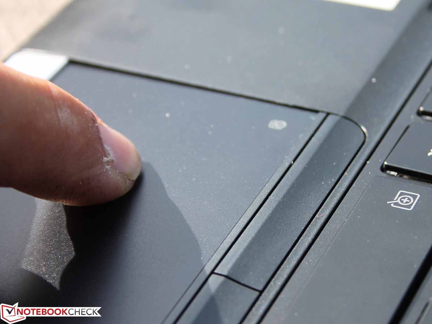Die matt schwarze Kacheltastatur (87 Tasten) hat leider keine Beleuchtung, das wäre in dieser Preisklasse aber Standard. Die vollkommen planen Tasten (keine konische Wölbung) haben einen deutlichen aber auf Grund des geringen Hubwegs kurzatmigen Druckpunkt. Die Tasten tippen sich sehr leichtgängig, der Anschlag ist gedämpft aber nicht weich. Das Feedback beurteilen wir als schwach, die EliteBooks und die ThinkPads führen deutlich bessere Eingaben mit sich. Pluspunkte sind die sehr deutliche, weiße Beschriftung, die ausgeklügelte Zweitbelegung (Fn-Tasten) und das Standard-Layout. Auf diese Weise kann zügig ein Ziffernblock-Ersatz aufgelegt oder die Zoom-Funktion genutzt werden.