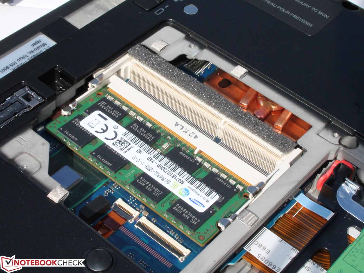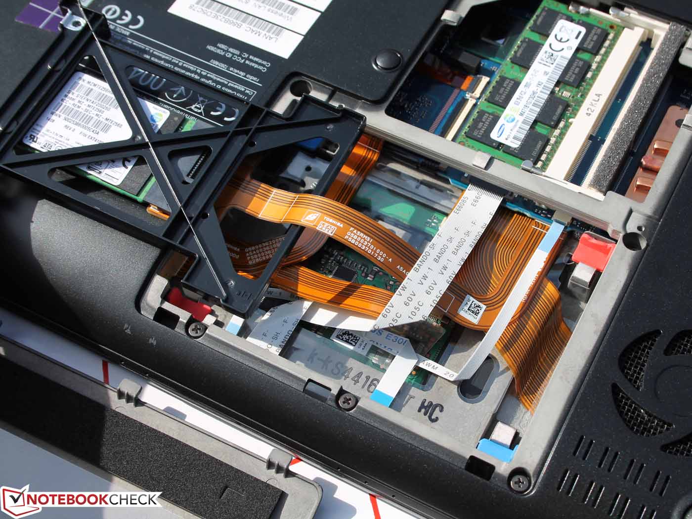 Die Komponenten werden über eine Klappe auf der Unterseite einfach erreicht, hier kann aber nur die SSD gewechselt und der Arbeitsspeicher erweitert werden (zwei Slots, einer frei). An das Funkmodul, die CPU (gesteckt) und die CMOS-Batterie kommt der Nutzer erst durch weiteres Zerlegen heran.