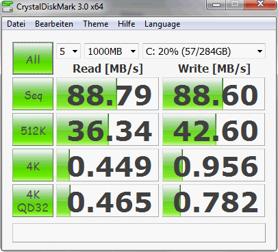 Die 320 GByte Festplatte des Herstellers Hitachi arbeitet recht flott, obwohl es sich um eine rotierende HDD handelt (7200 rpm). Sie liest mit 79 MByte/s im Sequential Read (HD Tune). Der Crystal Disk Mark als zweiter Test weist 89 MByte/s aus (andere Test-Routine als HD-Tune). Der HDD Score des PCMark Vantage geht mit 3.859 Punkten (Sub-Score) in die Spur. Das ist deutlich weniger als SSDs in unseren Testgeräten erreichen konnten (14.000 bis 20.000 Punkte, z. B. XMG A501). Damit beim mobilen Betrieb nichts passiert, dafür sorgt ein 3D-Sensor. Der Parkt die Lese-/Schreibköpfe bei Erschütterungen.