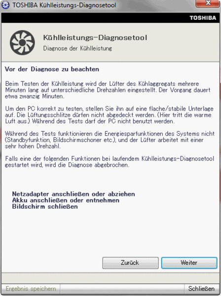 Insgesamt ist das Verhalten der Kühlung in Ordnung und das Grundrauschen der schnell drehenden HDD fällt fast gar nicht auf (31.5 dB(A), keine störende Vibration). Die maximale Lautstärke stimmt uns jedoch nachdenklich, denn dieses Gehäuse soll auch einen Core i7-2620M (Dual Core, Turbo 3.4 GHz + Turbo 2.0) kühlen können. Dies kann in der Praxis aber funktionieren, denn der i7 und der i3 haben denselben TDP von 35 Watt. Unserem i3-System bescheinigt das Toshiba Kühlleistungs-Diagnosetool immerhin ein "Gut" (Test mit 19 Minuten Last).