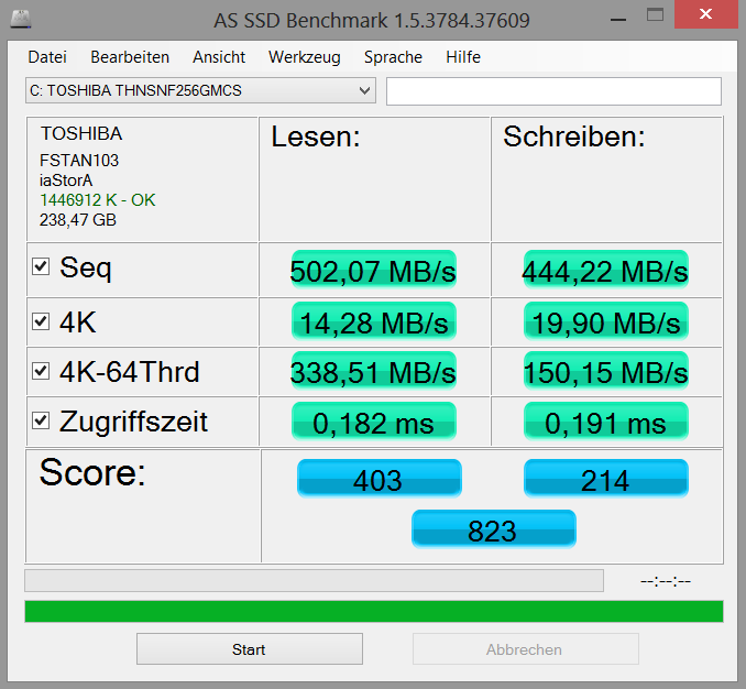 Die 256-GB-SSD (Toshiba THNSNF256GMCS) liefert gute Resultate, vor allem im Hinblick auf das Lesen kleiner Sektoren (4K-Tests). Die Samsung SSD MZ7PC128HBFU (EliteBook Revolve 810) und Intels 525 Series SSDMCEAC180A3L (ThinkPad Helix) laufen im 4K-Test aber schneller (+15 %). Etwas schwach fällt im Vergleich der 4K-Write-Test aus: 21 MB/s sind nur halb so viel, wie die übrigen Konkurrenten bieten.