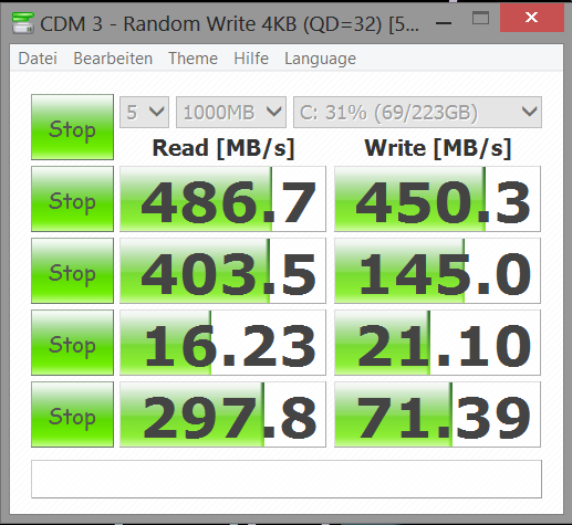Dafür gehen Kopier- und Schreibvorgänge großer Dateien ratzfatz über die Bühne; speziell im Write (450 MB/s) kann die Toshiba SSD die versammelte Konkurrenz um 42 bis 77 % deklassieren. Das Dell Latitude XT3 weicht erneut auf Grund seiner HDD negativ ab. Das Gigabyte S1185 ebenso, was zeigt: Im Performance-Detail ist nicht eine SSD wie jede andere.