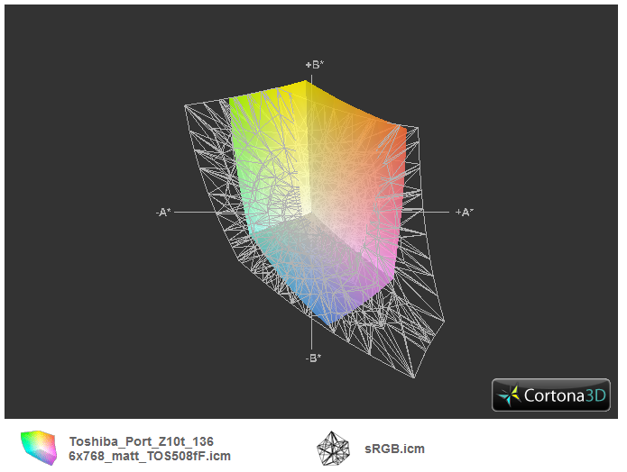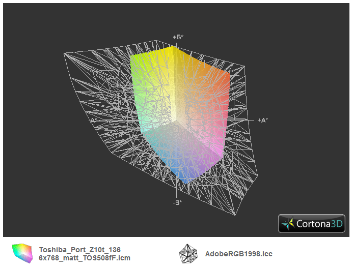 Der Kontrast des IPS-Panels ist über jeden Zweifel erhaben: 1.158:1, das schaffen die beiden Konkurrenten nicht (ThinkPad Helix 949:1; Revolve 810: 723:1). Damit die Anzeige höchsten professionellen Ansprüchen gerecht wird, sollte sie den sRGB-Referenzfarbraum abdecken. Den verfehlt sie, unisono mit HP und Lenovo, aber deutlich. AdobeRGB wird nur zu 44 % abgedeckt.