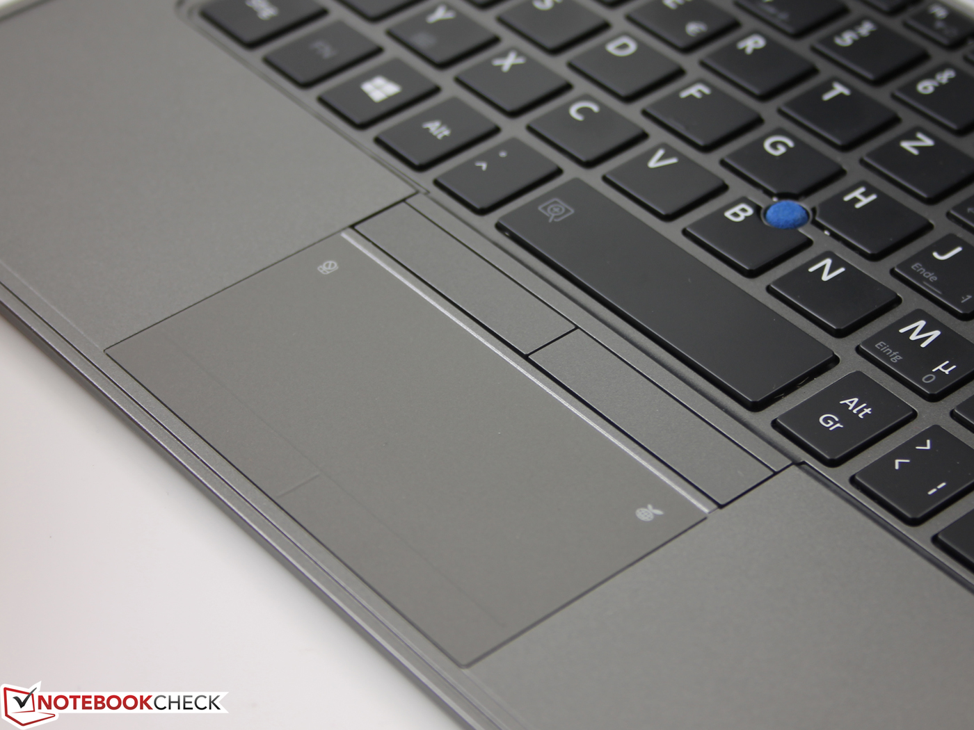 Das Touchpad liegt ebenerdig mit der Handauflage, die matte Oberfläche berührt sich aber leicht rutschiger als die umliegenden Bereiche. Es handelt sich nicht um ein ClickPad, die Tastenbereiche unten wurden jedoch haptisch etwas hervorgehoben. Die Drucktasten gehören in erster Linie zum AccuPoint, so nennt Toshiba den blauen Pointer in der Tastatur. Sie haben einen kleinen, aber ausreichenden Hubweg und ein sehr deutliches Feedback. Das Geräusch ist dumpf und leise. Der Pointer ist bei Auslieferung etwas langsam eingestellt. In Summe stellt die Combo aus AccuPoint, Pad und Tasten variabel einstellbare Eingabemöglichkeiten zusammen, mit der schnelles Agieren möglich ist.