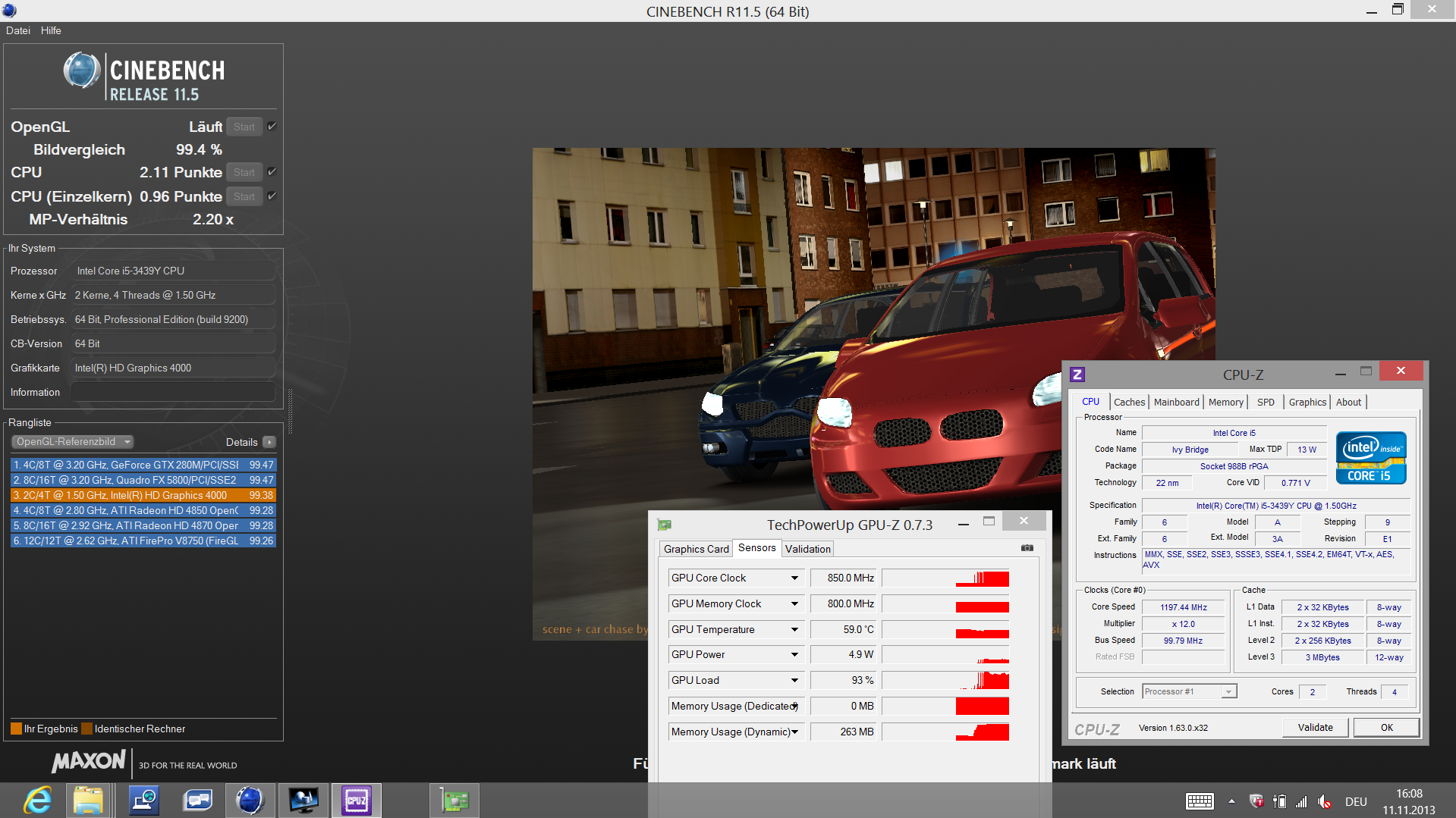 Kann der Core i5 3339Y (1,5 GHz) wirklich die Performance einer typischen Ultrabook-CPU wie dem Core i5 3437U (1,9 GHz) im EliteBook Revolve 810 erreichen? Nicht ganz, wie der Cinebench R11.5 zeigt. 27 % fehlen dem Z10t auf die reine Rechengeschwindigkeit des i5 3437U. Dennoch fällt der Multi-Score ungewöhnlich gut aus, was am Turbo von 2,1 GHz liegt. Normalerweise sollte der maximale Turbo für 2 Kerne bei 1,8 GHz liegen. Toshiba spricht in seinem Datenblatt über eine „erhöhte Intel SpeedStep Technologie.“ Bei (dauerhafter) Single-Core-Last bleibt der Takt übrigens identisch hoch.
