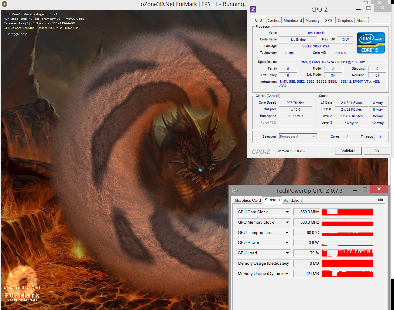 Wir führen den Stresstest aus um zu prüfen, wie sich Temperatur und System darunter verhalten. Die CPU gibt schon nach kurzer Zeit klein bei, sie reduziert den Takt auf 1,0 GHz. Die GPU scheint bei solcher Parallelbelastung Priorität im TDP-Haushalt zu haben, denn sie verharrt konstant bei ihren 850 MHz (Maximum). Bei obigen CPU-Benchmarks arbeitete die CPU bei erhöhtem Turbo (2,1 GHz), weshalb Nutzer im normalen Last-Betrieb nicht mit Leistungseinbrüchen auf 1,0 GHz rechnen müssen. Wir haben direkt nach dem Stresstest einen 3DMark 2006 ausgeführt, um Nachwirkungen der thermischen Belastung festzustellen. Es gibt aber keine, der Score fiel sogar dezent höher aus.