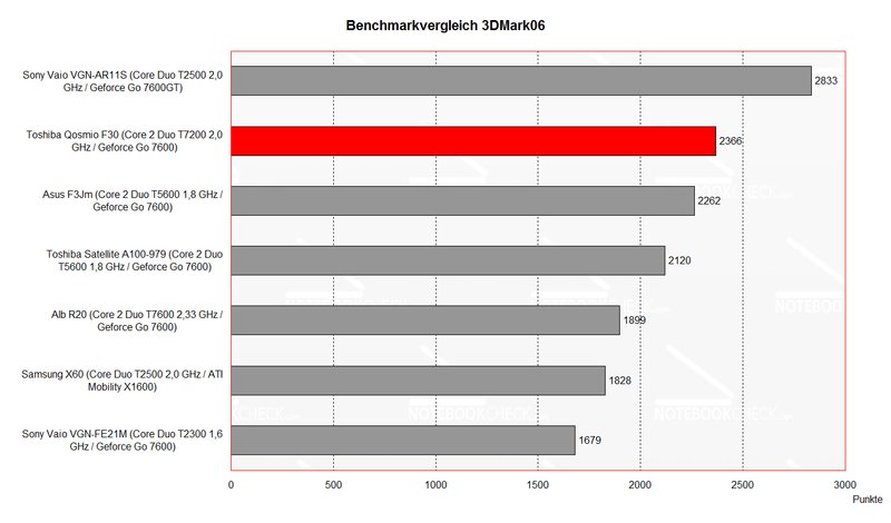 Das Toshiba Qosmio F30 verfügt neben einer leistungsstarken Core 2 Duo T7200 CPU mit 2.0 GHz über eine NVIDIA Geforce Go 7600 Grafikkarte. Obwohl diese Grafiklösung in der Leistungsklasse 2 in unserem Vergleich mobiler Grafikkarten anzusiedeln ist, zeigt diese hervorragende Benchmarkergebnisse.