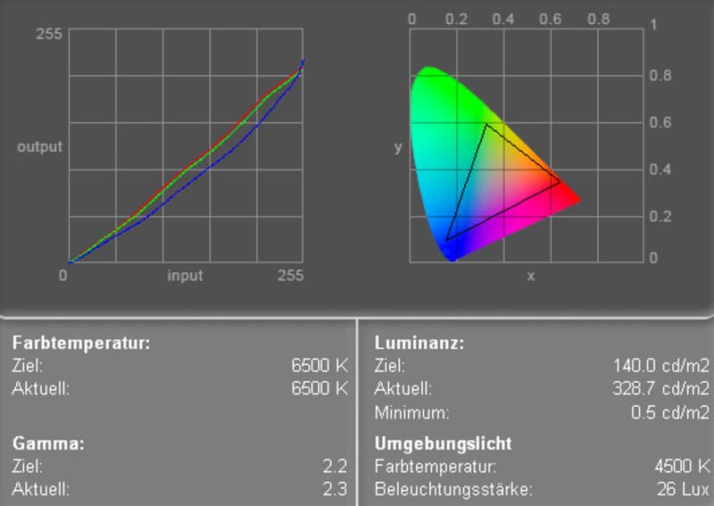 Das Display hingegen überzeugt beinahe auf der ganzen Linie: Sehr gute Helligkeit und ausgezeichneter Kontrast sowie eine erstklassige Blickwinkelstabilität sprechen für sich. Leider war die errechnete Ausleuchtung nicht ganz so toll, was aber bei diesen guten Helligkeiten nicht so schwer ins Gewicht fällt.