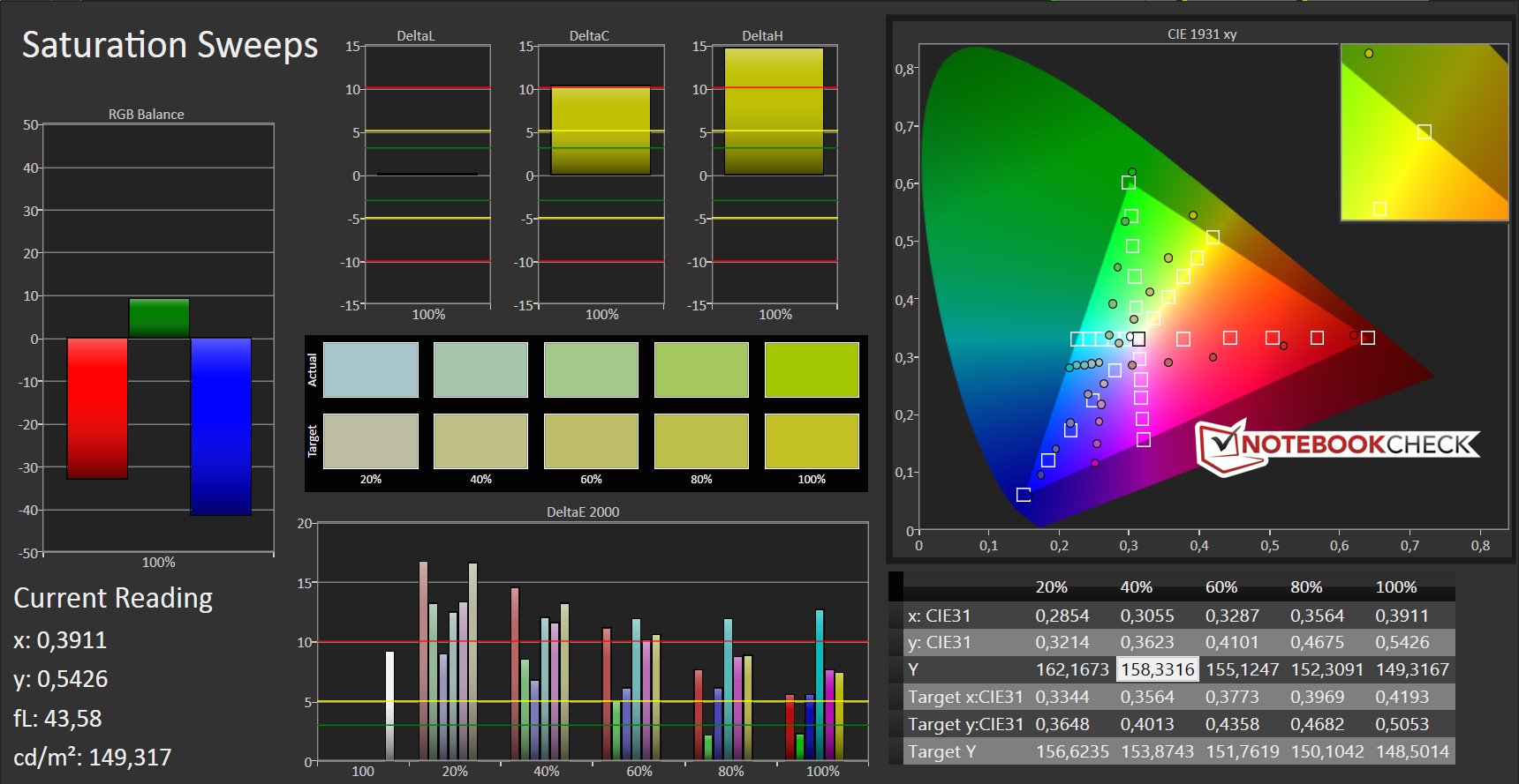 Obwohl das Kontrastverhältnis von 571:1 und der sich resultierende Schwarzwert von 0,5 cd/m² etwas besser als die der Konkurrenz sind, sorgt der hohe Schwarzwert für ein unschönes Verschwimmen der Graustufen. Ebenso fällt der starke Blaustich auf, welcher auch vom CalMAN mit einer Graustufenabweichung von 11,69 bestätigt wird. Die Farben kommen mit einem deltaE-Wert von über 10 nicht besser weg. Dank eingesetztem IPS-Panel profitiert das Acer hier mit Abweichungen um 7, welche nach der Kalibrierung noch einmal deutlich verbessert werden können.