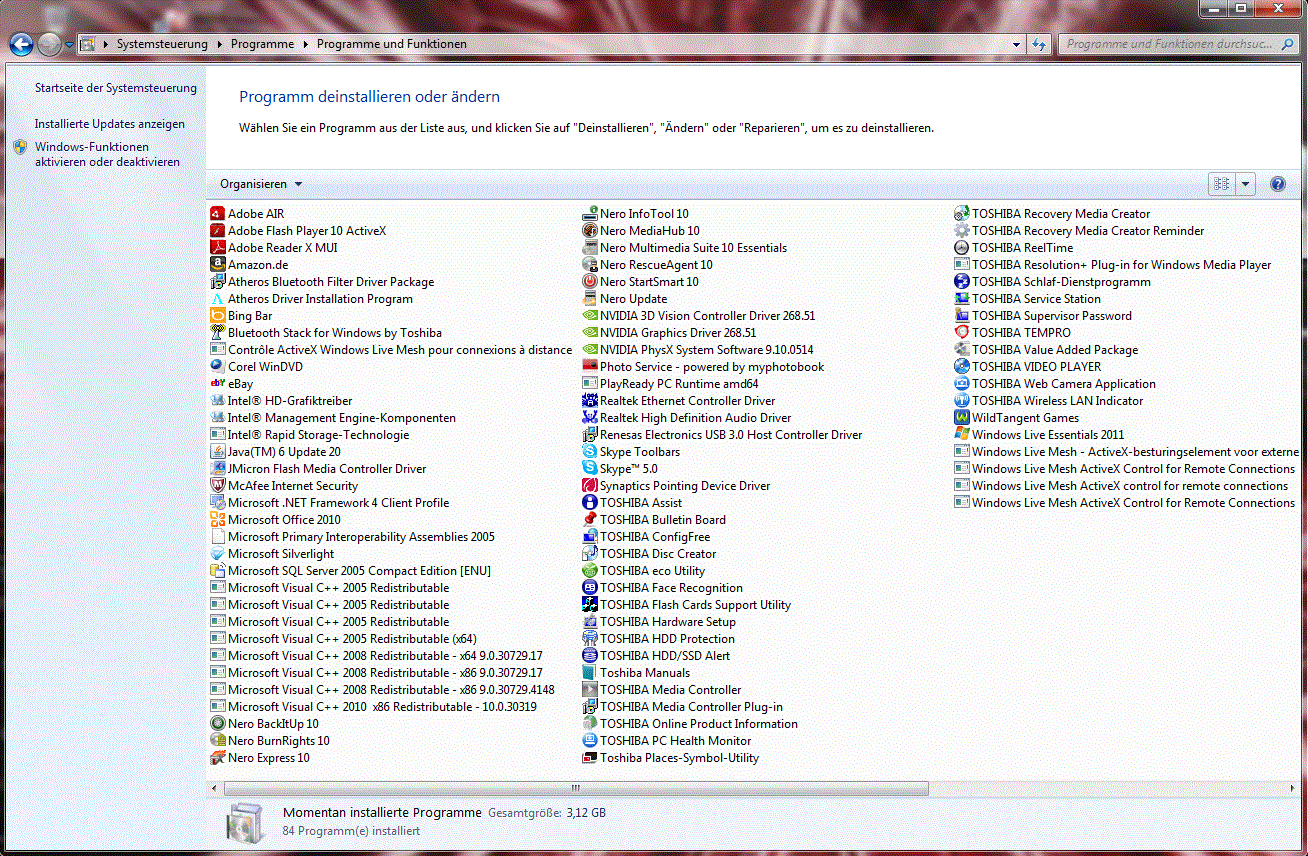 Bei der Softwareinstallation kennt Toshiba anscheinend keine Gnade. Das Notebook explodiert geradezu vor Programmen, viele Bestandteile sind mehr als unnötig. Allein knapp 30 Anwendungen tragen den Namen „Toshiba xyz“ (siehe Screenshot). Folge: Die Taskleiste wird von diversen Icons belagert, der Nutzer muss häufig Pop-up-Meldungen über sich ergehen lassen. Auch Bootzeit und Reaktionsgeschwindigkeit könnten besser sein. Wer seine Nerven schonen will, sollte den überflüssigen Ballast entfernen.