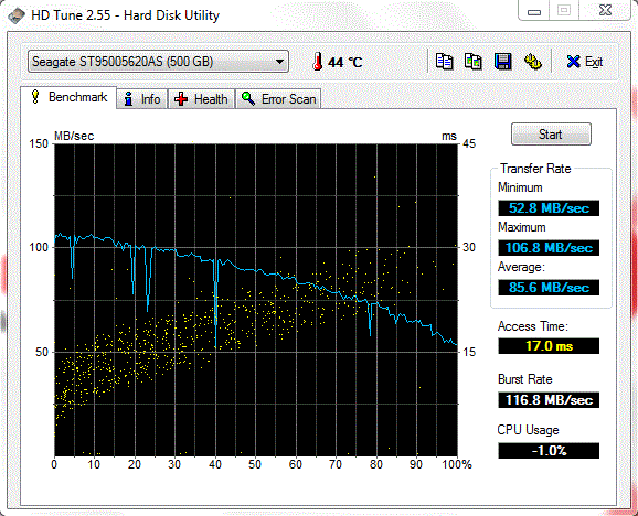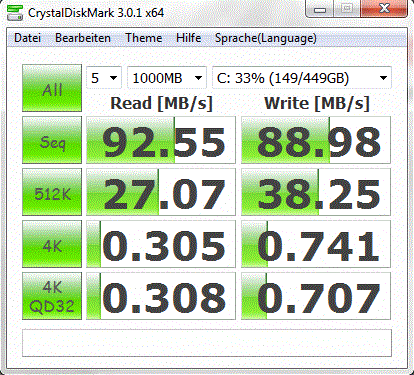 Bei den Festplatten hat Toshiba eine ungewöhnliche Konstellation gewählt: Zu einer 500 GByte großen HDD (Seagate ST9500423AS) gesellt sich ein 500 GByte großes Hybrid-Modell (Seagate ST95005620AS), das eine Mischung aus HDD und SSD darstellt. Dank ihrer flotten Drehzahl (7200 U/Min) können beide Festplatten mit einer hohen Performance aufwarten. Trotz ihres fehlenden Flash-Speichers war die HDD in den Benchmarks etwas schneller unterwegs als die SSH (= Solid State Hybrid). Diese können vor allem bei oft wiederholt gelesenen Daten punkten, die dann im SSD-Cache gespeichert werden und so schneller ausgeliefert werden.