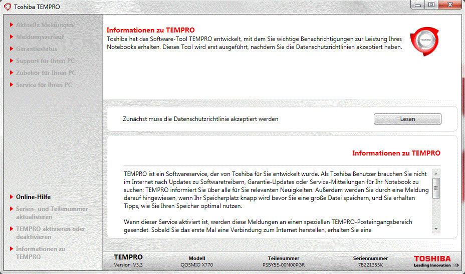 Toshiba gewährt seinen Kunden eine Garantie von zwei Jahren (Bring-In). Wer sich beim Hersteller registriert, kann das Gerät im Bedarfsfall abholen lassen (Pick-Up-Service).