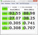 Während die Systemfestplatte auf eine sequentielle Leserate von 92.55 MB/Sek und eine sequentielle Schreibrate von 88.98 MB/Sek kam, erzielte die HDD im CrystalDiskMark 109.6 respektive 108.7 MB/Sek. Auch die Zugriffszeit war bei der HDD etwas besser (15.4 gegen 17.0 ms). Dennoch halten wir das HDD/SSH-Duo für eine nette Idee. Tipp: Wer über das nötige Kleingeld verfügt, sollte den Kauf eines klassischen Solid State Drive erwägen - Sie werden den Unterschied merken. Beide Festplatten-Slots sind problemlos zugänglich.