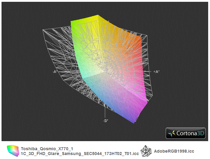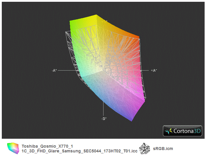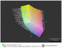 Bietet das FHD-Panel aber auch einen profi-tauglichen sRGB-Farbraum? Den sRGB Farbraum verfehlt das 3D-Panel knapp, dafür kann es aber im gelben Bereich mehr Farben darstellen. Die HD+ Version (X770-10J und andere Modelle) toppt unser FHD-Panel aber auf jeden Fall: Das Farbgitter wird deutlich nach allen Seiten hin überlagert. Siehe Bild Drei. Das Gaming-Schlachtschiff von Asus, das G74SX-3DE, ist in dieser Disziplin einen Tick besser.