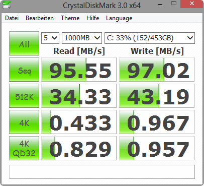Die Toshiba HDD (MQ01ABF050, 500 GB) verhält sich in Sachen Lautstärke als auch bezüglich der Datendurchsätzen ruhig. Die 2,5-Zoll-Festplatte (Bauhöhe 9,5 mm) hat nur eine Rotationsgeschwindigkeit von 5.400 RPM. Die Zugriffszeit von 17,9 ms ist für diesen HDD-Typ in Ordnung. Die Sequential-Read-Werte liegen auch nur bei 83 bis 95 MB/s. Kleinere, verstreute Dateien werden noch viel langsamer gelesen (4K: 0,433 MB/s). Aus diesen Gründen fallen die HDD-Scores in den System-Benchmarks niedrig aus.