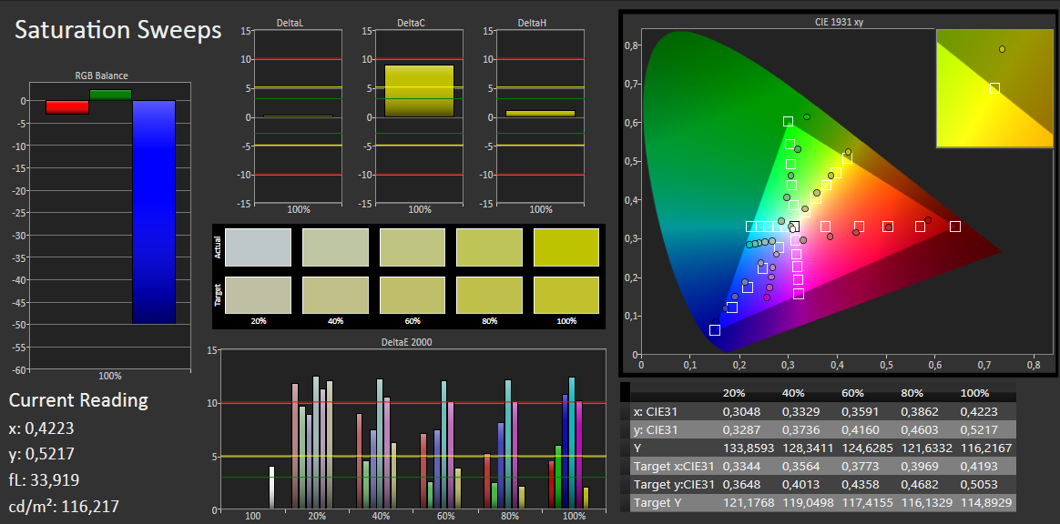 Der Screen-Farbsättigung zeigt: Magenta, Cyan und sogar Rot rutschen in den blauen Bereich ab. Die drei haben einen hohen DeltaE(2000) von 10. Dies bedeutet: Die Farbverfälschungen sind bereits mit dem bloßen Auge erkennbar, sofern der Betrachter Vergleichsfarbkarten hat (Screens: Actual/Target). Dieses Missverhältnis kann durch eine Kalibrierung mit entsprechender Hardware abgemildert werden.