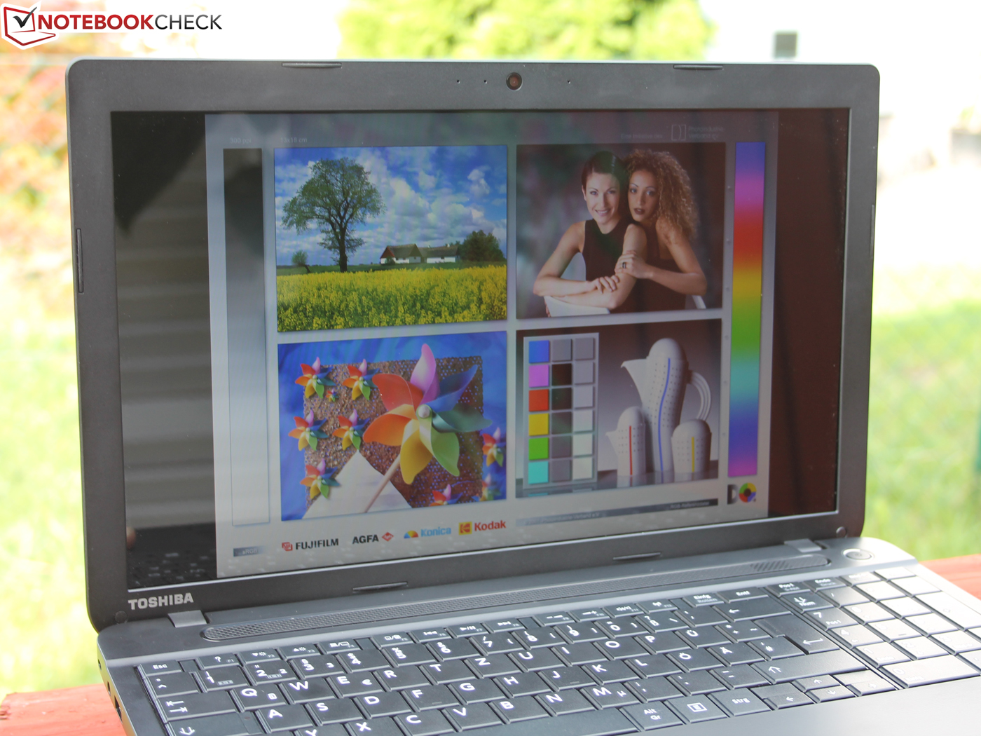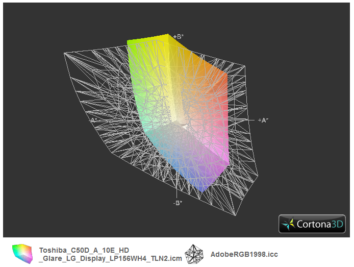 Farbräume bzw. eine TFT-Kalibrierung sind ein Thema für die professionelle Zielgruppe (Bildbearbeitung und Druck). Das sind nicht die Käufer des Toshiba C50D. Die Messergebnisse wollen wir der Vollständigkeit halber aber auflisten. Der kleine sRGB-Raum wird nicht annähernd abgedeckt (72 %), folglich auch nicht AdobeRGB (49 %).