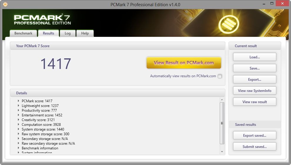 | PCMark 7 Score | 1417 Punkte | |