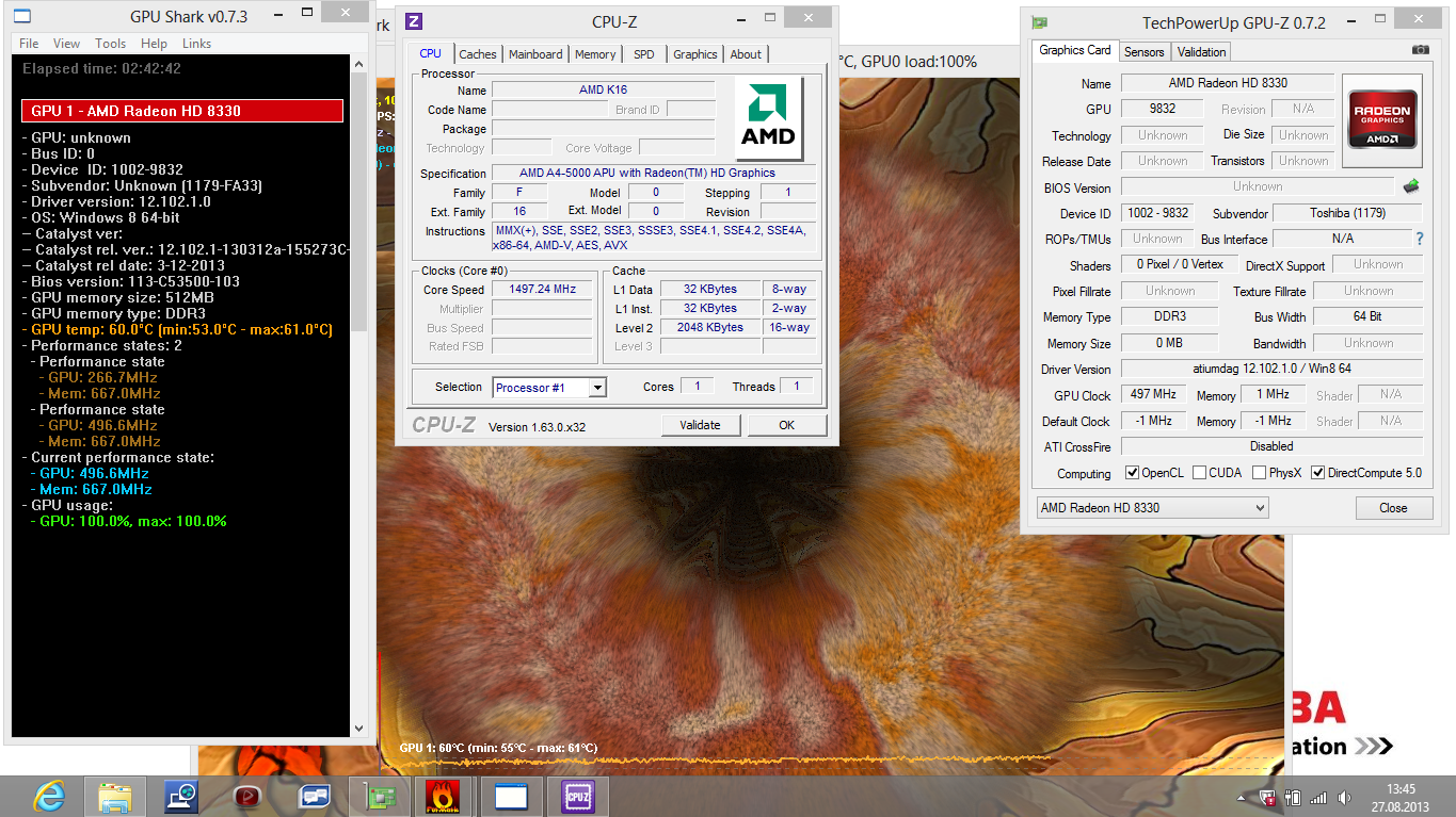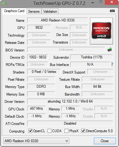 Die Radeon HD 8330 besitzt nur zwei Compute Units, die mit 500 MHz (kein Turbo) arbeiten und lediglich Single-Channel RAM unterstützen. Das Abspielen von hoch auflösenden Videos bewältigt die GPU problemlos, sie hält der CPU dabei den Rücken frei (Hardwareunterstützung durch Video Decoder). Die reine Rechenleistung (OpenGL 64Bit) hat sich gegenüber dem Vorgänger leicht erhöht (+19 %, E2-1800, Serie 3 355E5C). Gegenüber der HD 7400G im nominellen Vorgänger A4-4355M sehen wir jedoch Gleichstand. Der HD Graphics (-23 %) des Pentium 2020M ist die HD 8330 überlegen, die HD 4000 (Ivy Bridge) liegt gleichauf.